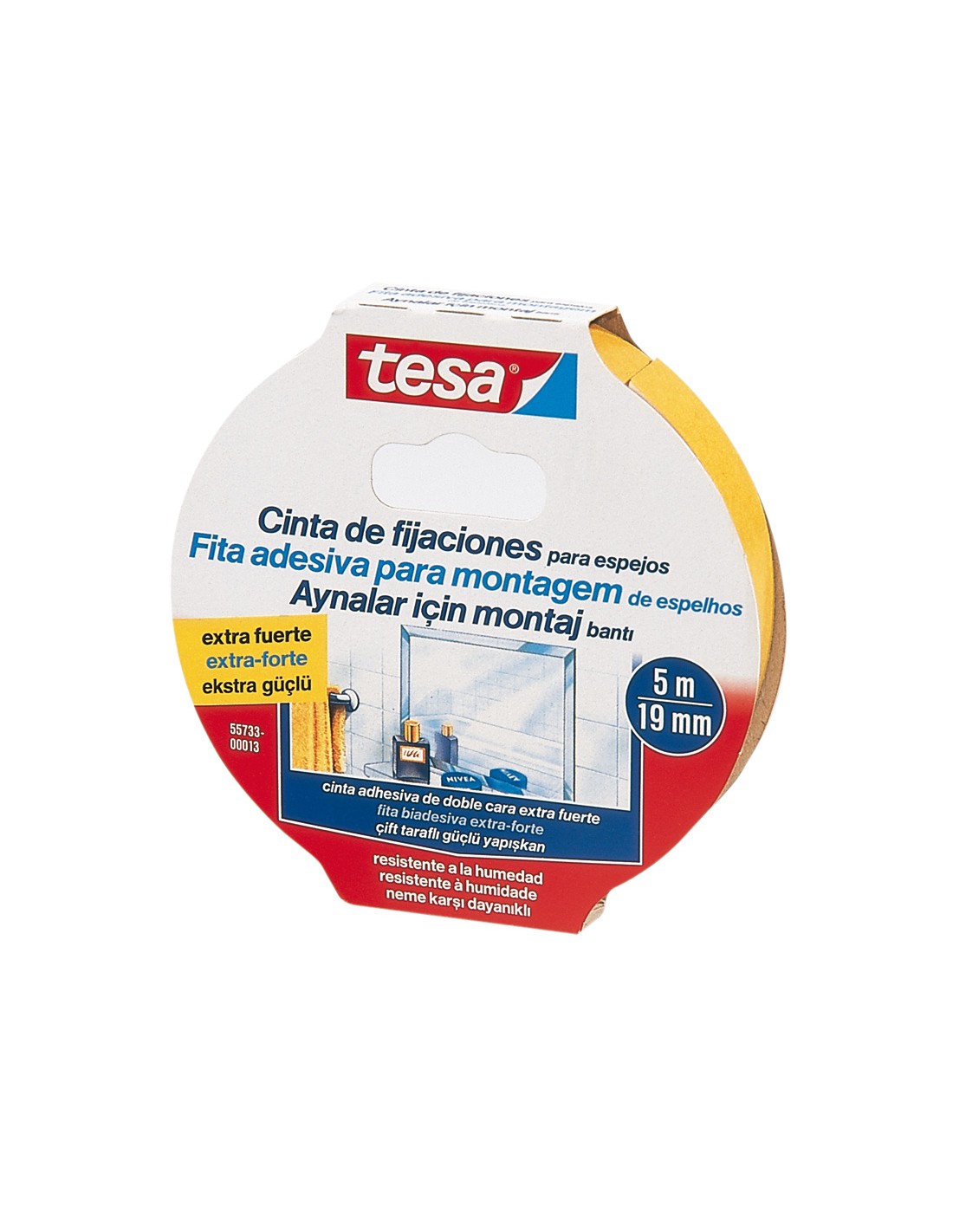 Cinta doble cara TESA extrafuerte. Fijación especial de espejos, etc. Fijación segura incluso en lugares húmedos. Color blanco. 5 m x 19 mm.