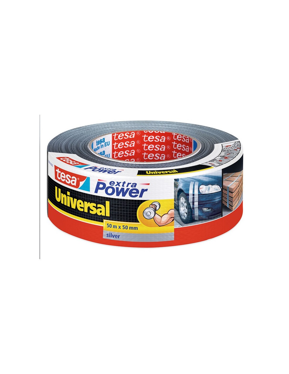 Cinta americana TESA Extra Power Universal Soporte tejido plástico PET y algodón recubierto con adhesivo de caucho natural. Adhesión en superficies rugosas. Se corta con la mano. 50 m x 50 mm. Plata.