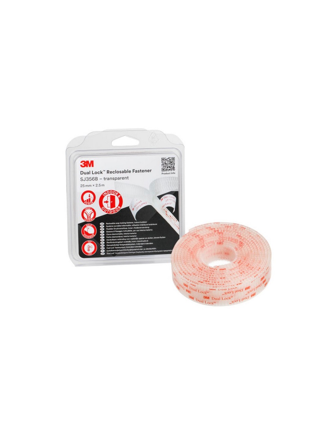 Cinta cremallera textil adhesiva Dual Lock 3M SJ3560 Sistema de cierre transparente con filamentos en forma de setas, con adhesivo acrílico transparente sensible a la presión. Resistencia a la tracción cinco veces mayor que las sujeciones de gancho y bucle tradicionales 2,5 m x 25 mm.