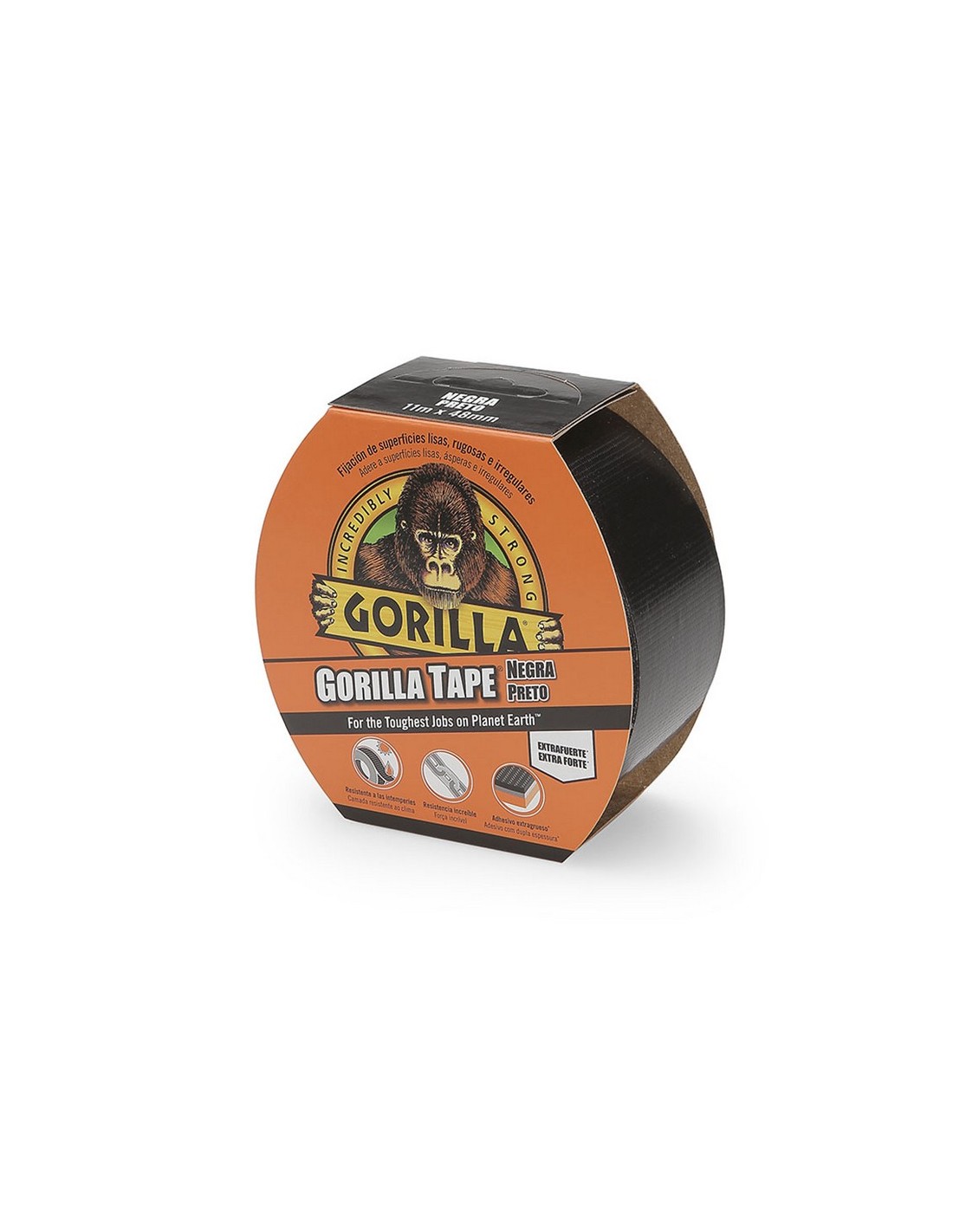 Cinta americana GORILLA Cinta extrafuerte, tri-capa e impermeable. Malla interna reforzada y adhesivo de doble grosor. Capaz de pegar metal, ladrillo, estuco, madera y otros. 11 m x 48 mm. Negra.