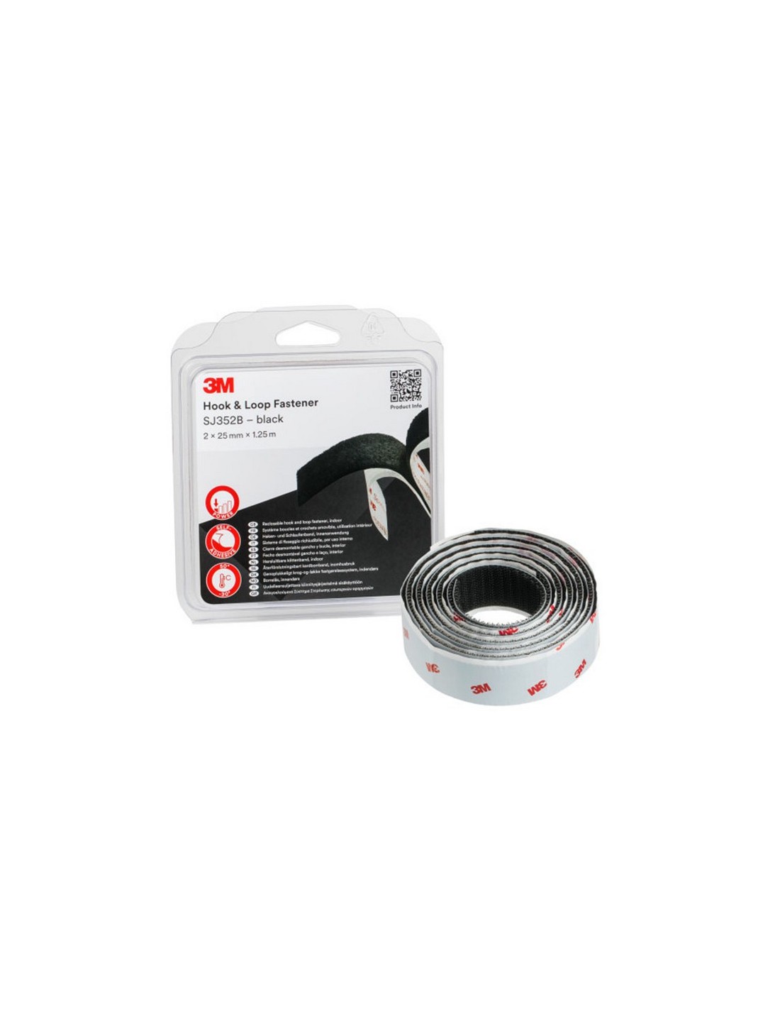 Cinta cremallera textil adhesiva 3M SJ352B Sistema de cierre reposicionable Hook and Loop. Adhesivo a base de caucho de alto rendimiento diseñado para aplicaciones en interiores que requieren resistencia a temperaturas medias. El nailon tejido es duradero para miles de cierres. Negro. 25x1.25 m, 4,4 mm.