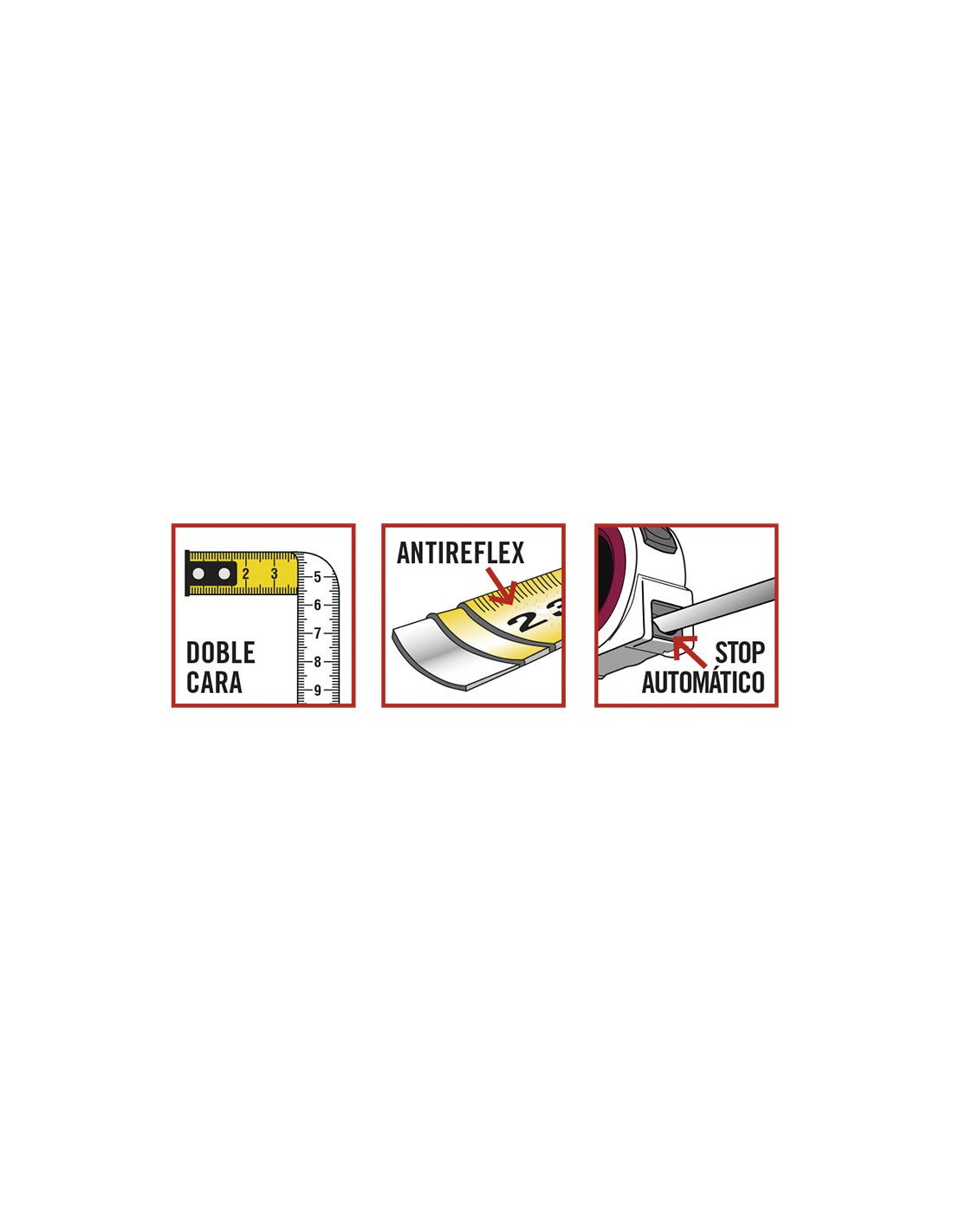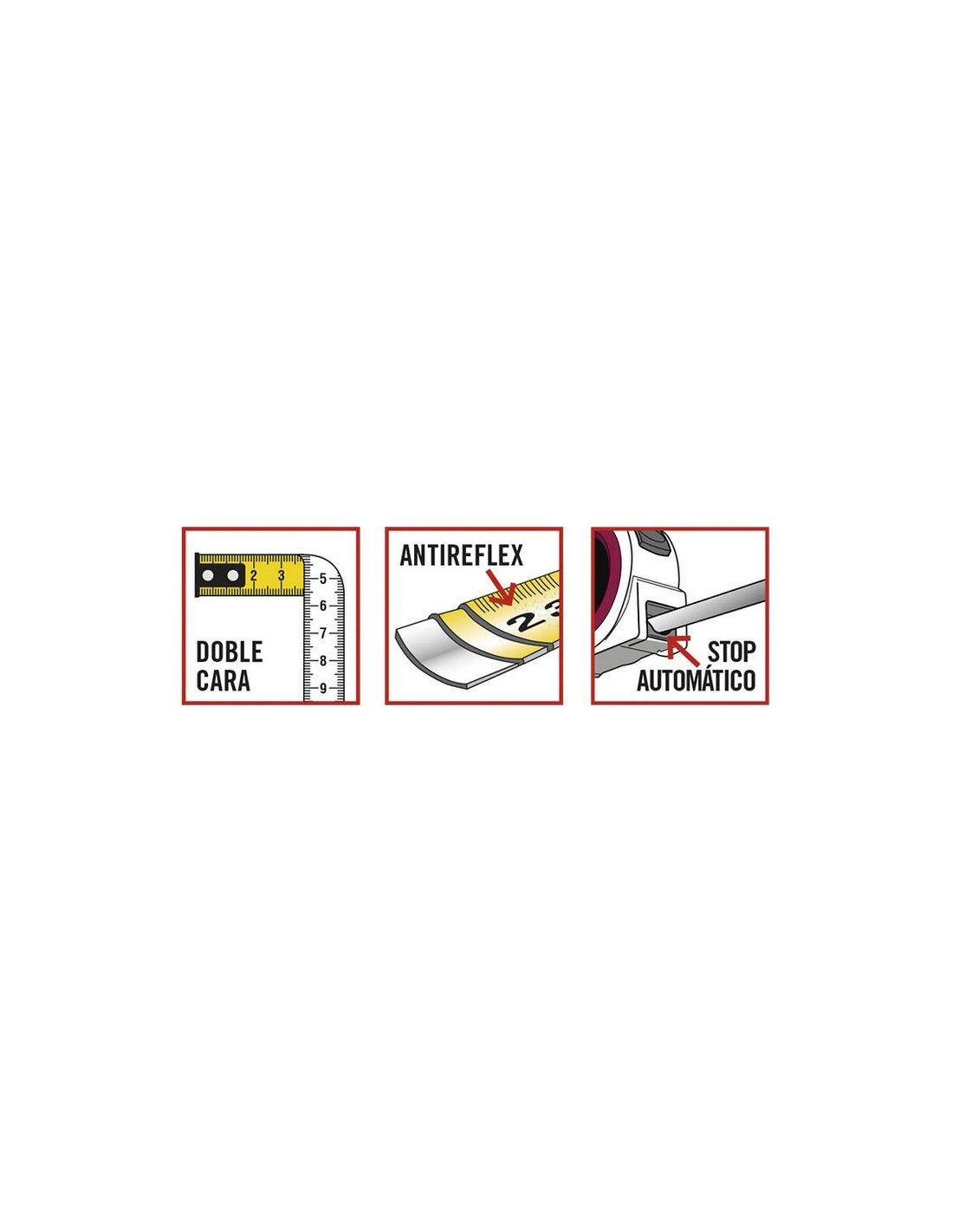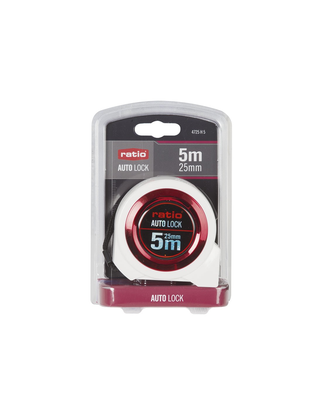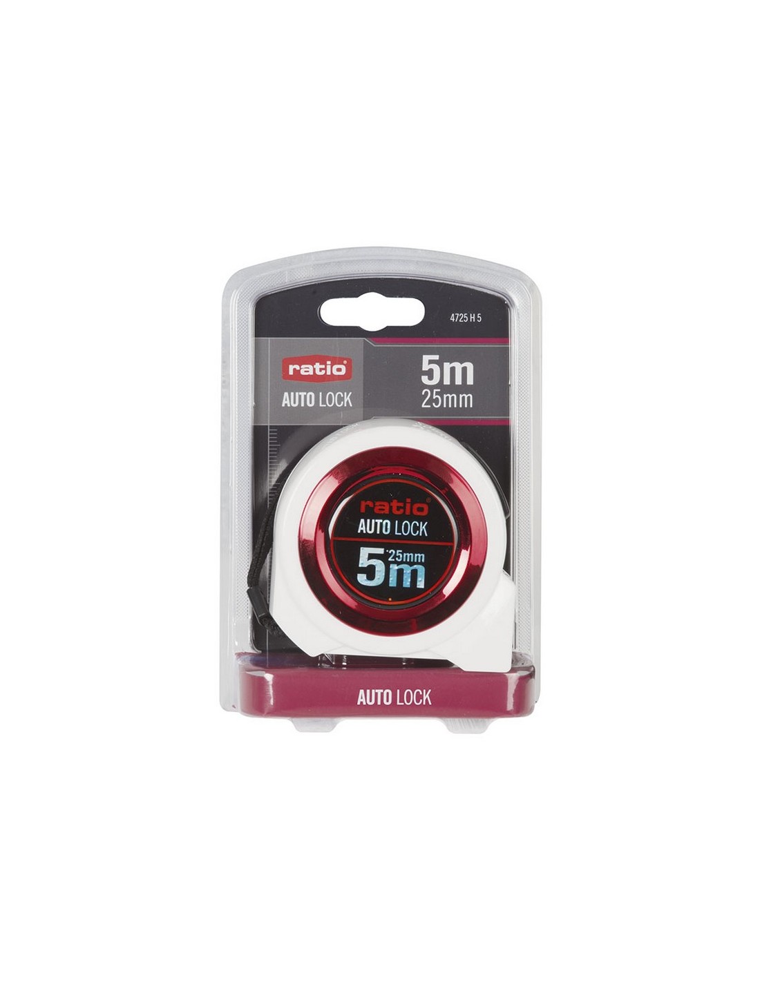 Flexómetro RATIO Auto lock Carcasa ABS. Cinta con sistema de bloqueo automático. Cinta numeración doble cara (amarilla/blanca) con revestimiento nilón antireflex. Gancho reforzado. Clip para cinturón. Homologado CE. Clase de Precisión II. 5 m. Cinta 19 mm.