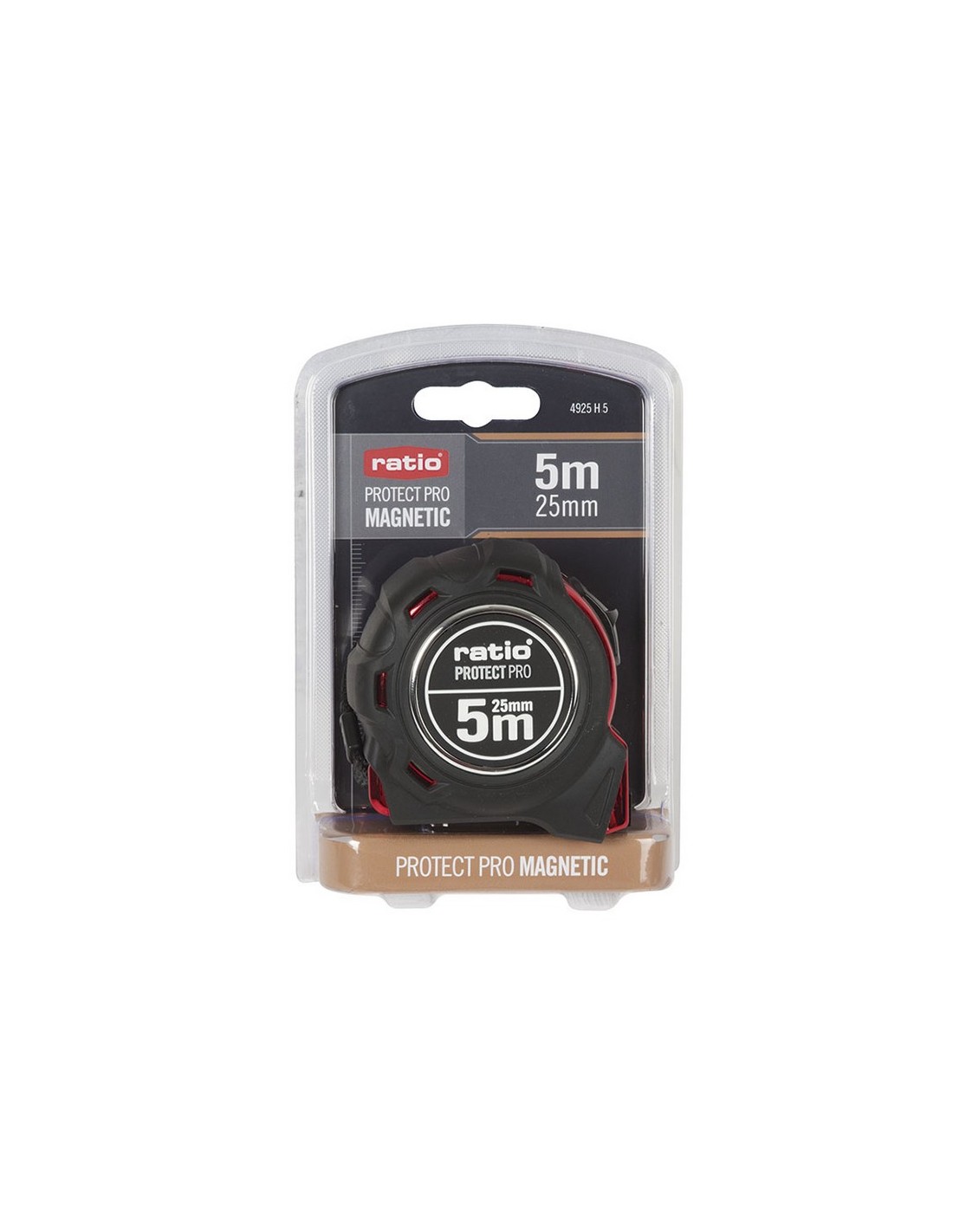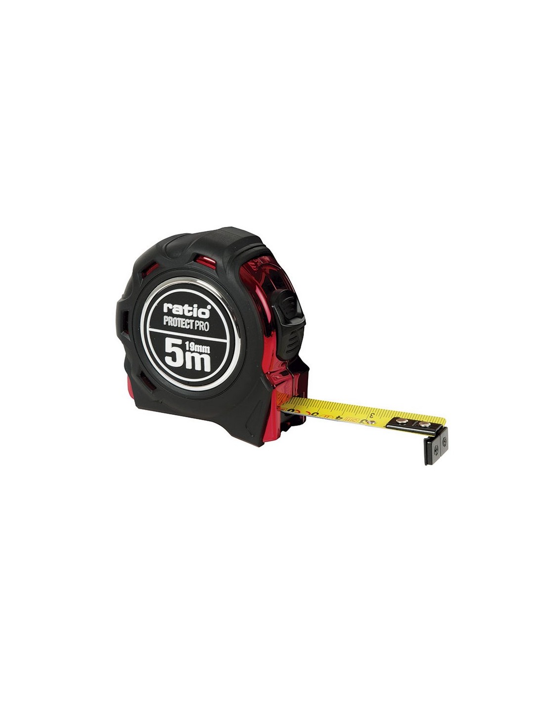 Flexómetro RATIO Protect Pro magnético ABS con recubrimiento antideslizante. Cinta numeración doble cara (amarilla/blanca) con revestimiento nilón antireflex. Gancho reforzado y magnético. Clip para cinturón y botón de bloqueo. Homologado CE. Clase de Precisión II. 5 m. Cinta 19 mm.