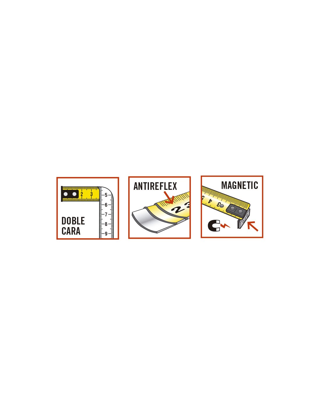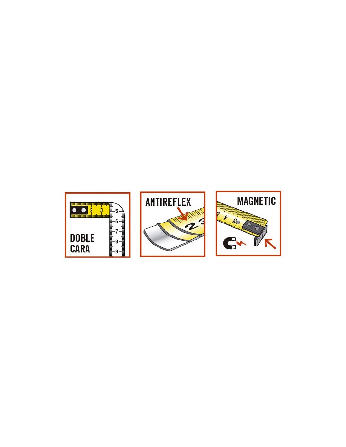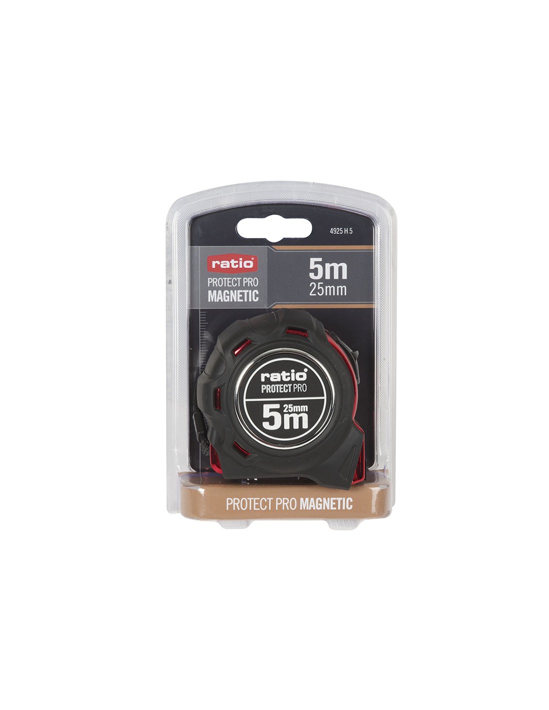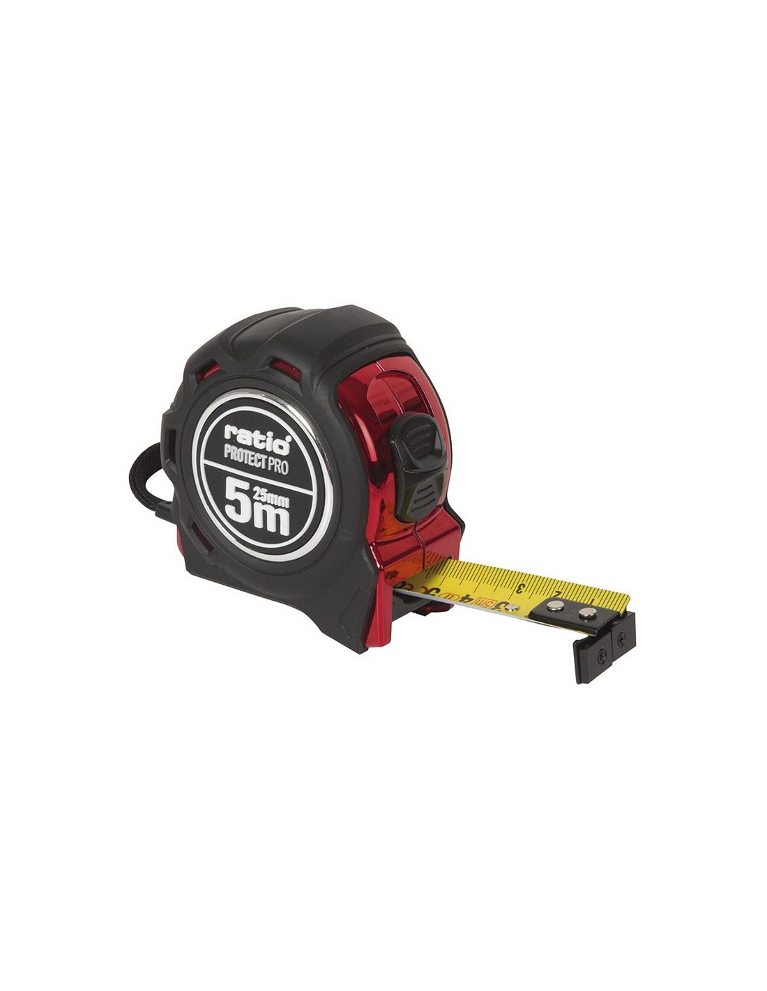 Flexómetro RATIO Protect Pro magnético ABS con recubrimiento antideslizante. Cinta numeración doble cara (amarilla/blanca) con revestimiento nilón antireflex. Gancho reforzado y magnético. Clip para cinturón y botón de bloqueo. Homologado CE. Clase de Precisión II. 5 m. Cinta 25 mm.