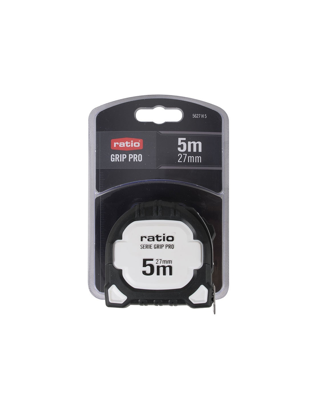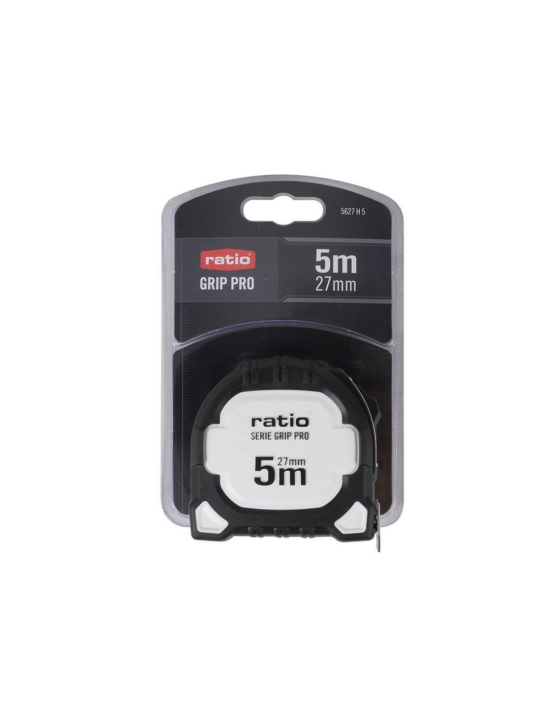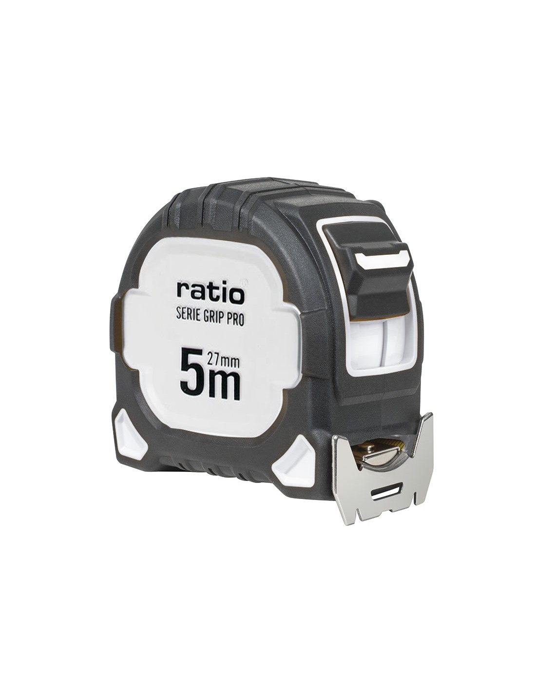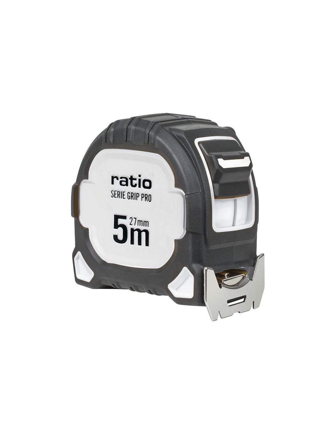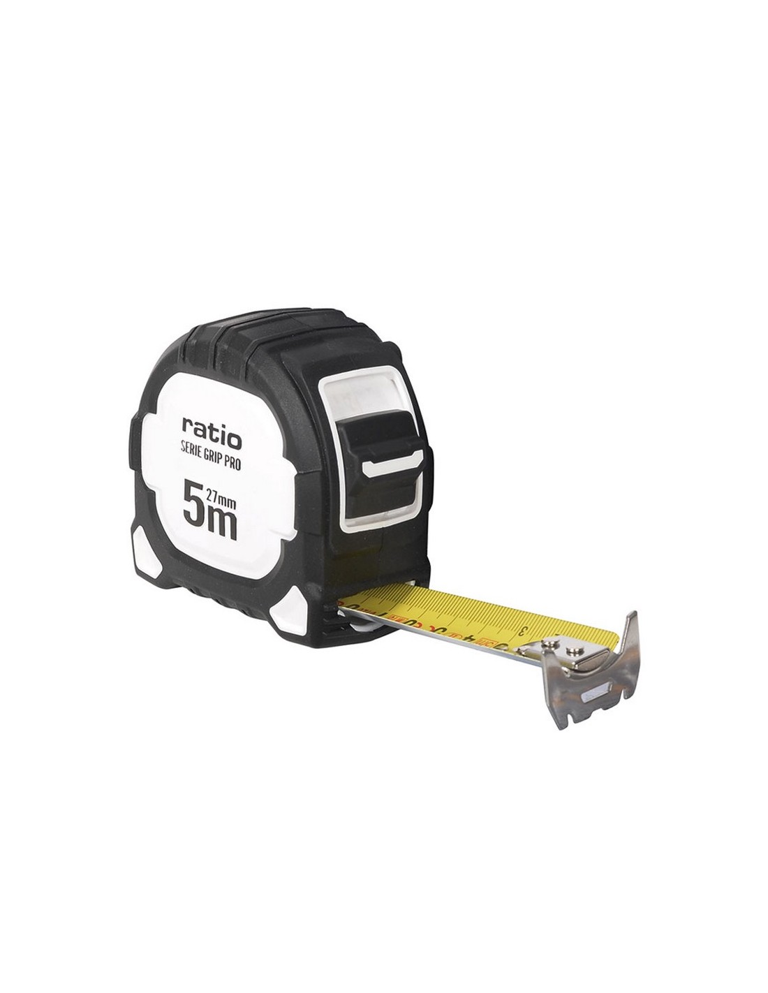 Flexómetro RATIO Grip Pro. Carcasa ABS con recubrimiento antideslizante. Cinta numeración doble cara (amarilla/blanca) con revestimiento nilón antireflex. Gancho inox doble reforzado y magnético. Botón de bloqueo y clip de grandes dimensiones para cinturón. Homologado CE, clase de Precisión II. 5 m. Cinta 27 mm.