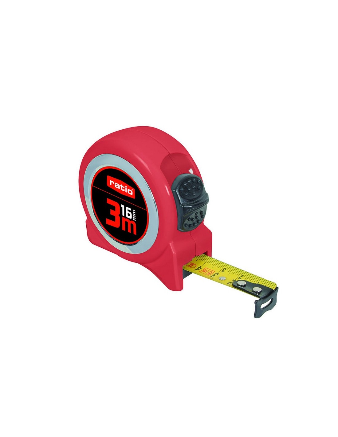 RATIOBASICFlexómetro RATIO Basic serie 43 Carcasa roja ABS. Cinta con revestimiento nilón antireflex. Gancho reforzado. Clip para cinturón y botón de bloqueo. Homologado CE. Clase de precisión II. Presentado en un display ready to sell. 3 m. Cinta 16 mm. 15 unid.