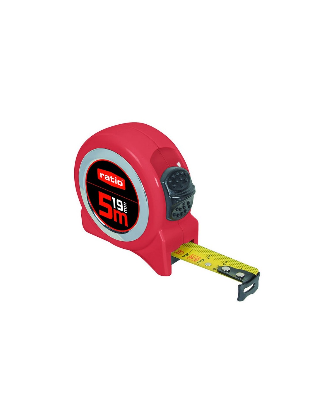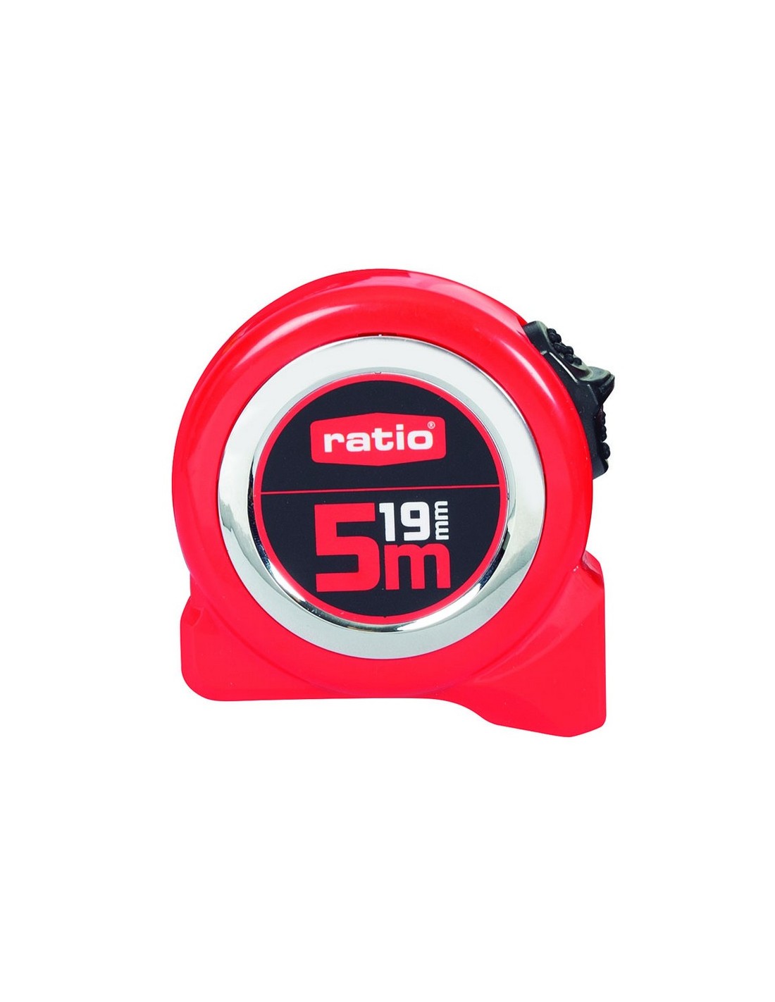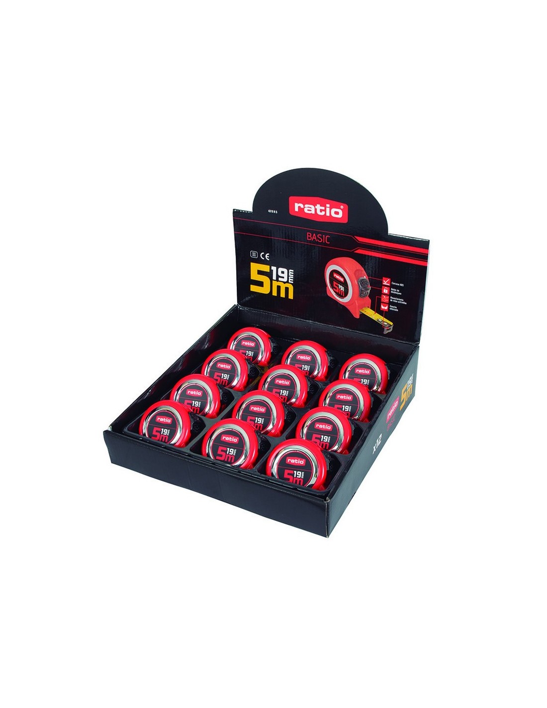 RATIOBASICFlexómetro RATIO Basic serie 43 Carcasa roja ABS. Cinta con revestimiento nilón antireflex. Gancho reforzado. Clip para cinturón y botón de bloqueo. Homologado CE. Clase de precisión II. Presentado en un display ready to sell. 5 m. Cinta 19 mm. 12 unid.