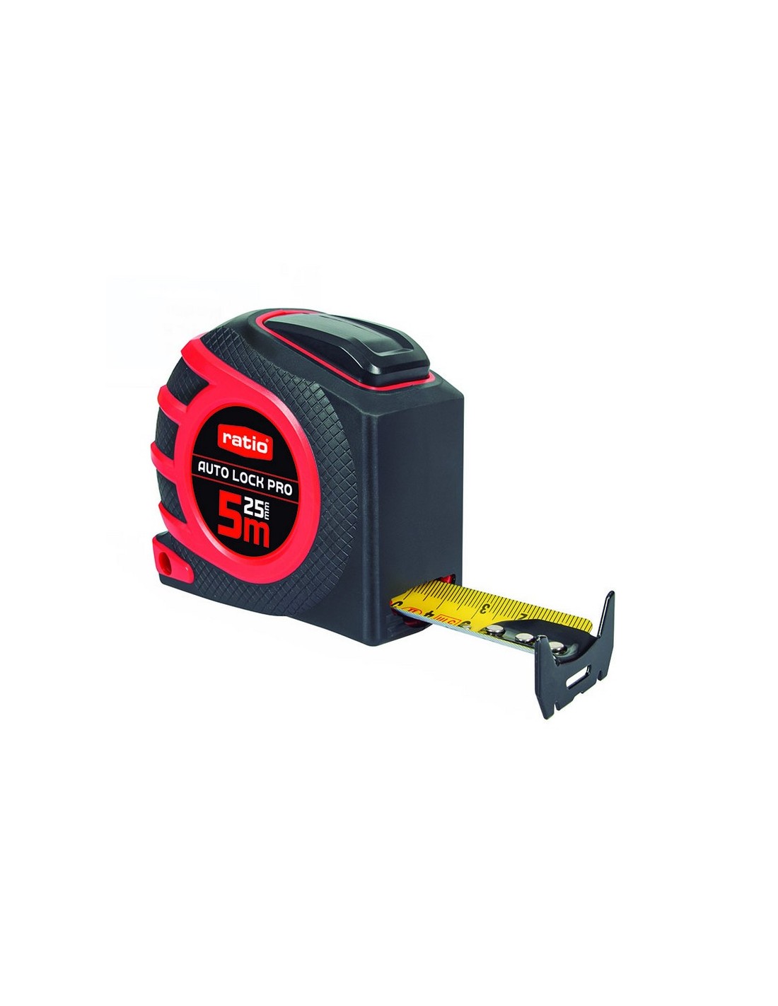 Flexómetro RATIO Auto Lock Pro Carcasa ABS, con recubrimiento antideslizante y con sistema de bloqueo automático. Cinta numeración doble cara (amarilla/amarilla) con revestimiento nilón antireflex. Gancho reforzado. Clip para cinturón y botón de bloqueo. Homologado CE. Clase de Precisión II. 5 m. Cinta 25 mm.