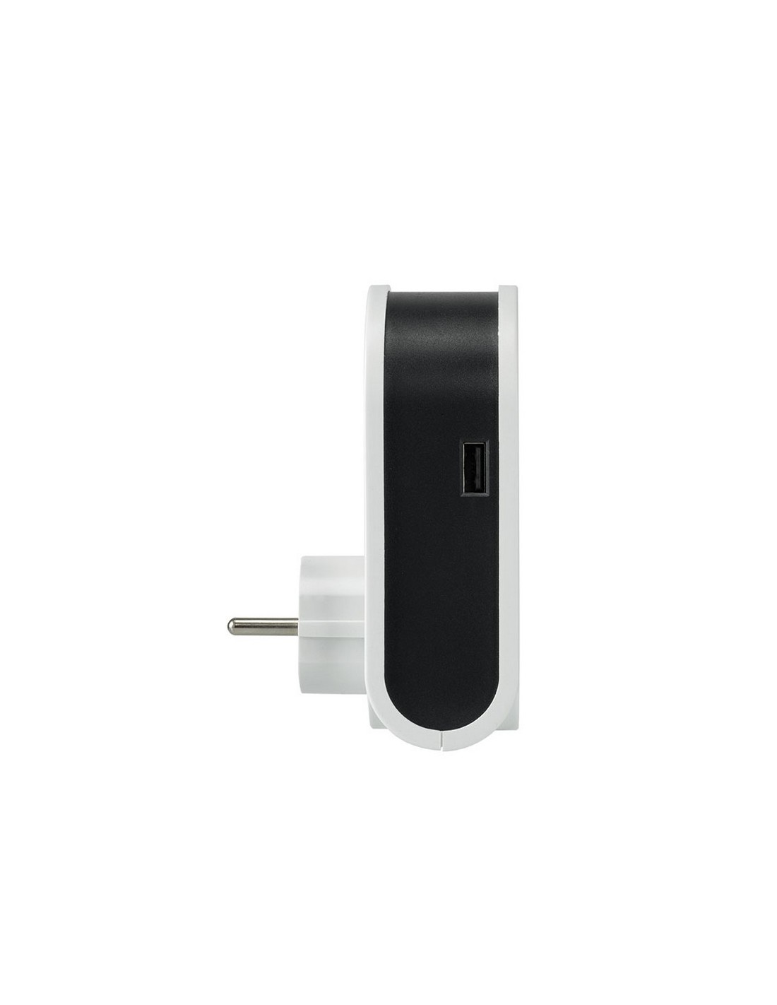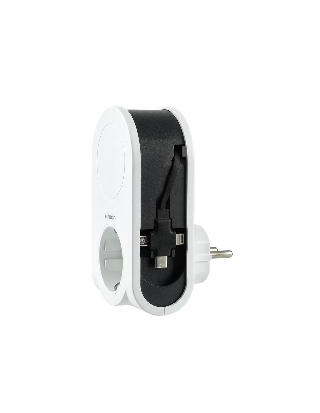 Adaptador 3 clavijas USB Simón Cable enrollable. 1 puerto USB-A, 1 toma.