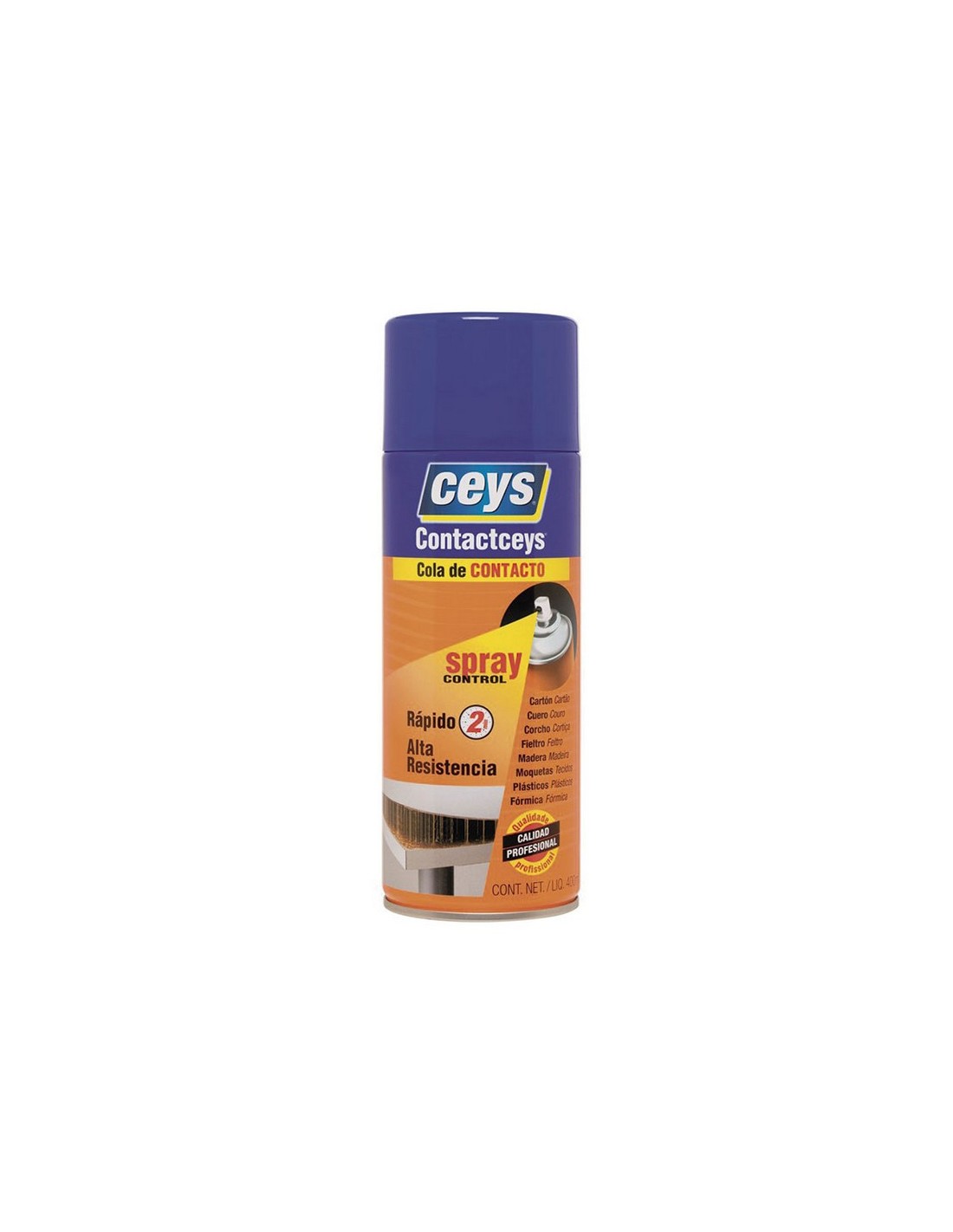 Adhesivo contacto spray CEYS. Polivalente. Pulverización regulable. Pegado de madera, poliestireno, poliéster, plástico, cerámica, aluminio, etc. Resiste temperaturas de hasta +70º. 400 ml.
