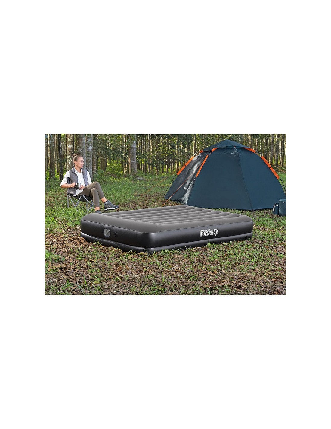 Colchón inflable BESTWAY Tritech Queen Superficie terciopelo. Parte inferior vinilo. Almohada integrada. Doble altura. Sistema inflado automático integrado. Bomba USB 5V-2A. Incluye parche de reparación. Medidas: 203x152xh.36 cm.