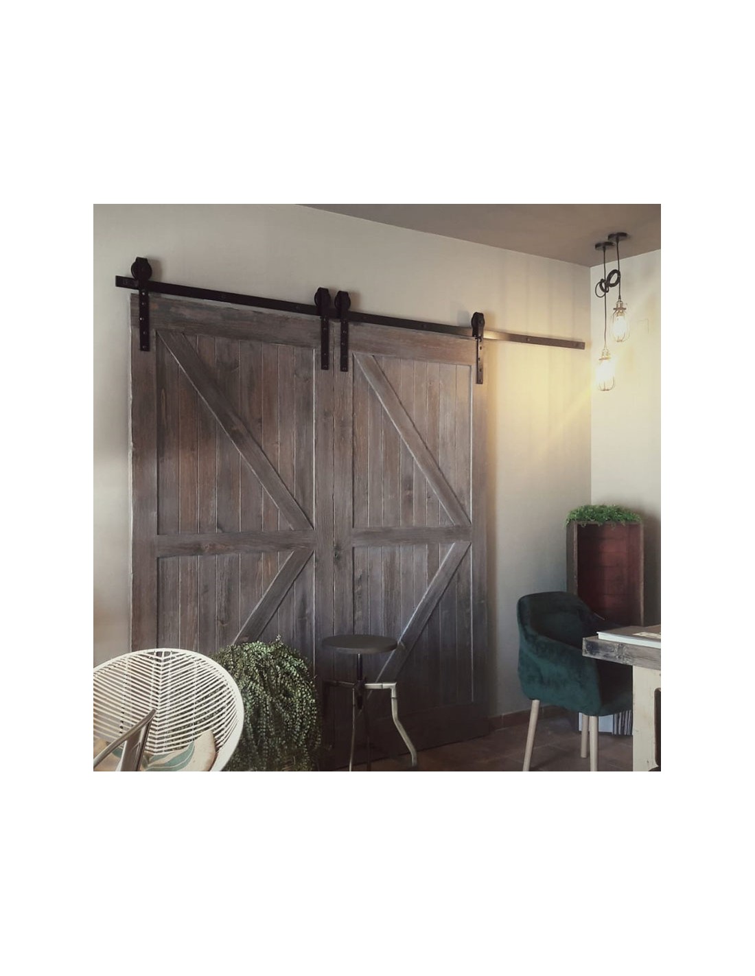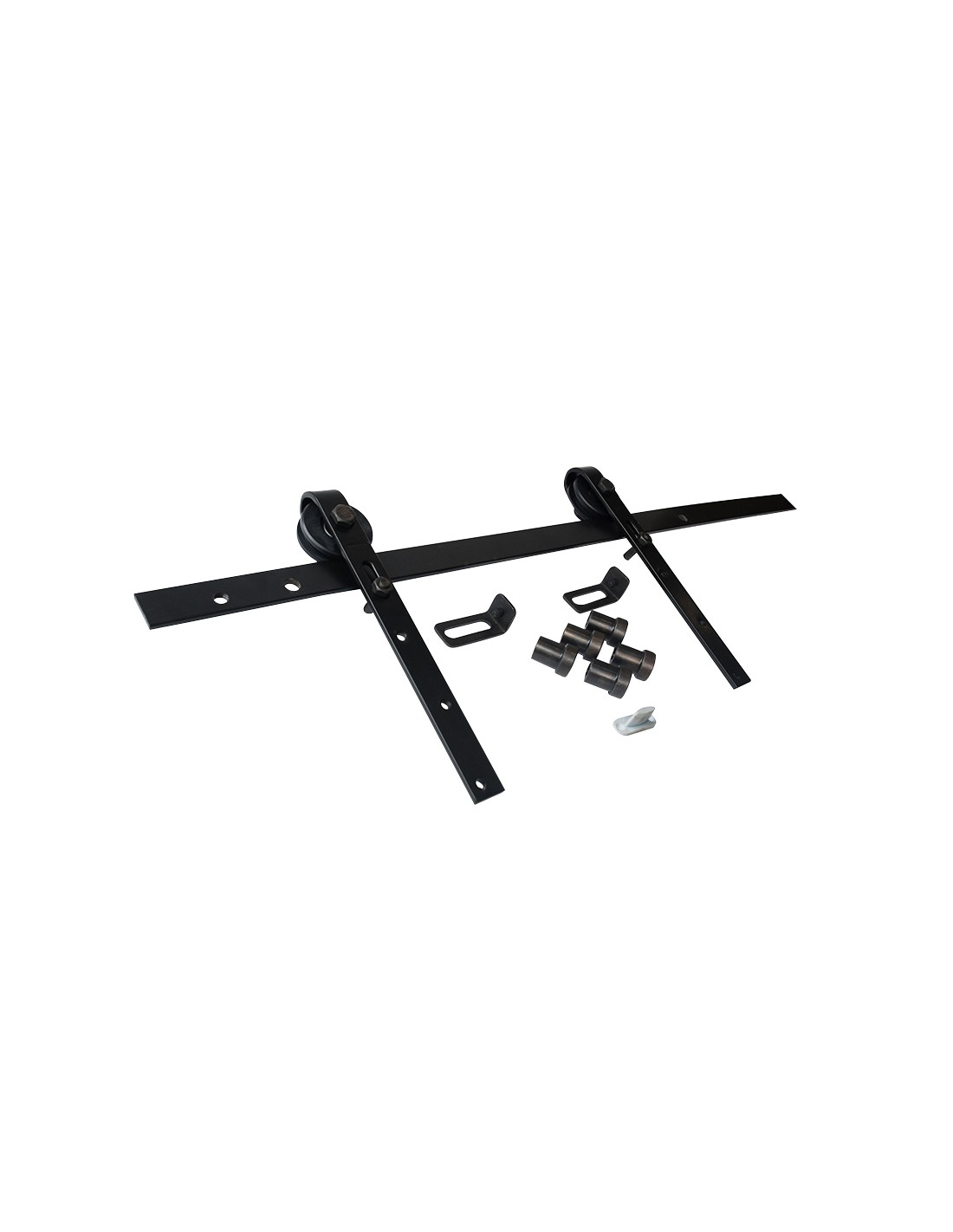 Kit herrajes puerta corredera rústica ESTEBRO Compuesto por dos poleas de nilón, una guía deslizante, 2 topos rústicos, 5 separadores de pared y una guía inferior. Guía 45x8x200 mm. 100 kg.