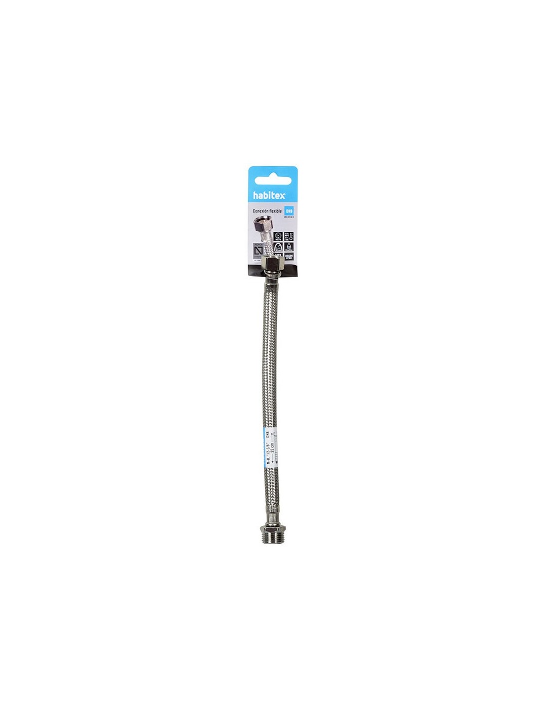 Conexión flexible sanitario HABITEX DN8 (Latiguillo). Tubo caucho sintético, trenzado con hilos de acero inoxidable. Racor latón niquelado ø 8 mm. H-H. 1/2-3/8. 30 cm.