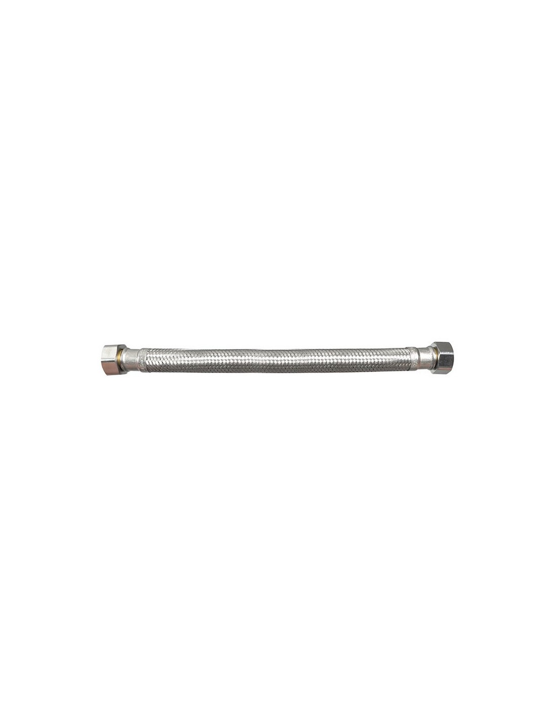 Conexión flexible sanitario HABITEX DN13 (Latiguillo). Tubo caucho sintético, trenzado con hilos de acero inoxidable. Racor latón niquelado ø 13 mm. M-H. 1/2. 25 cm.