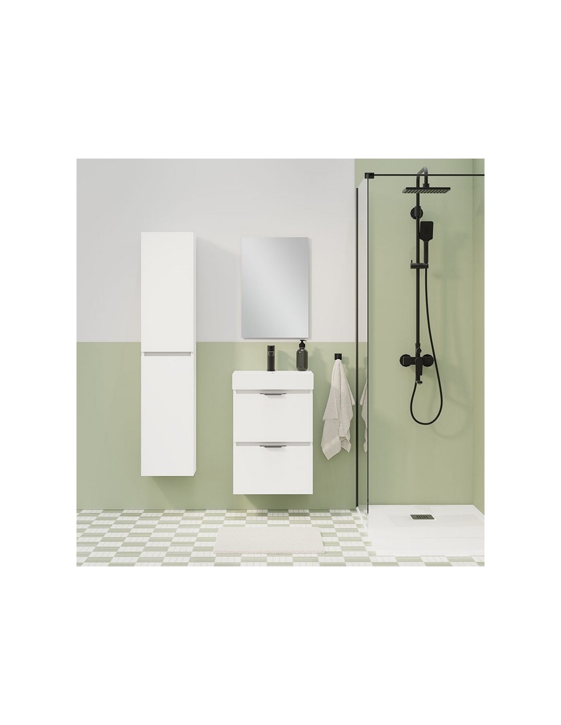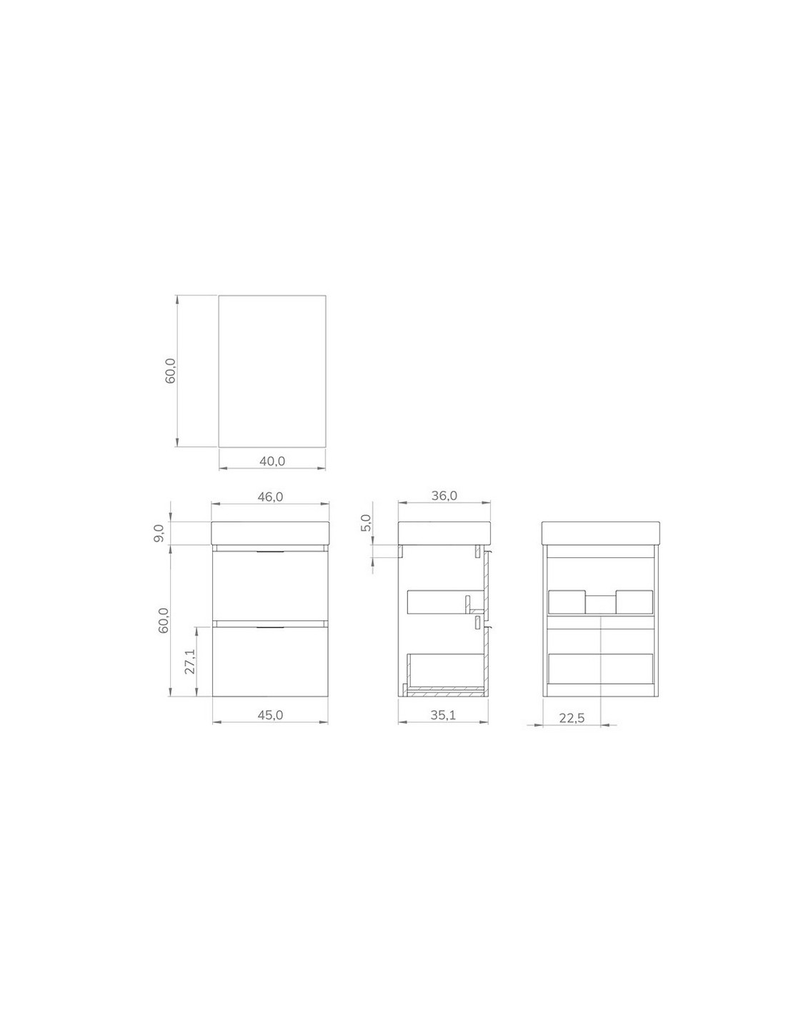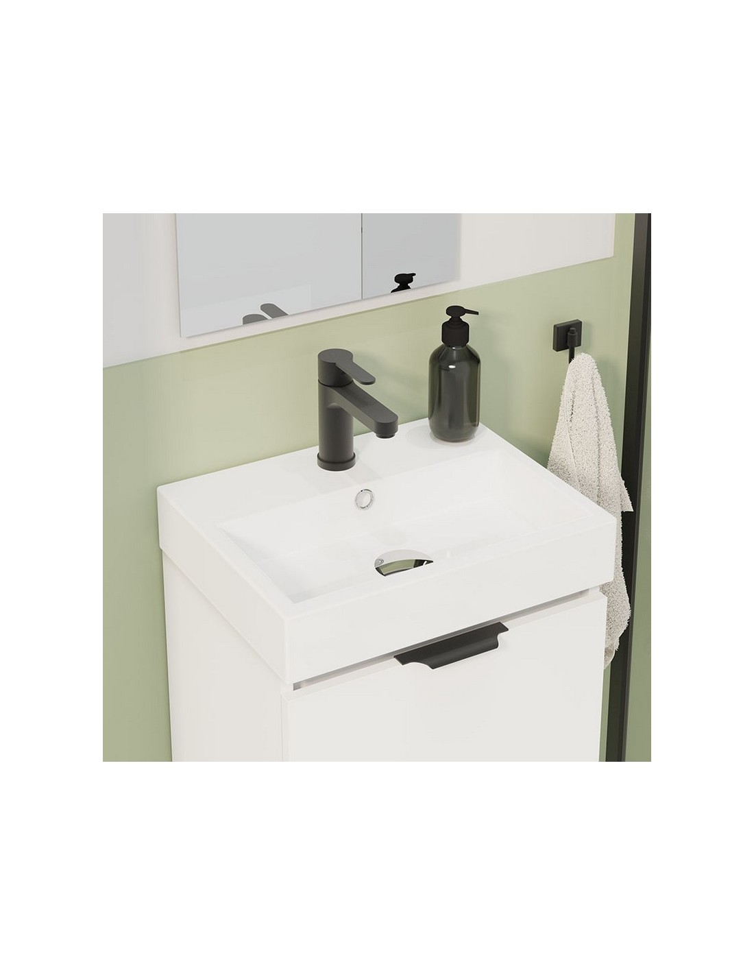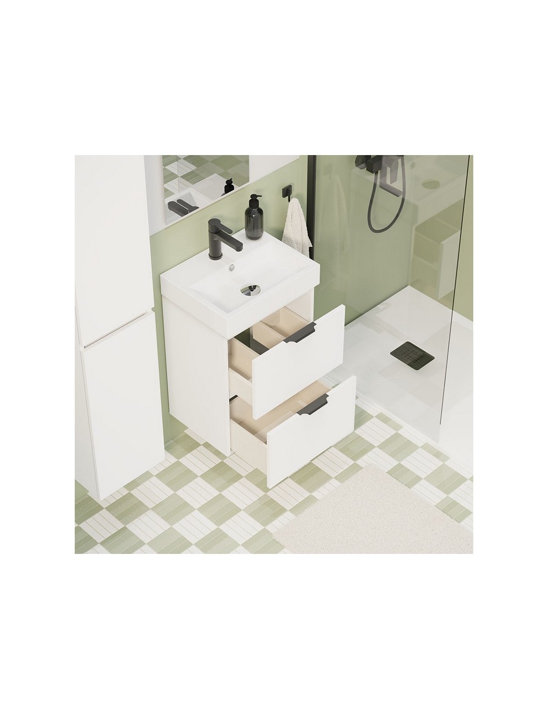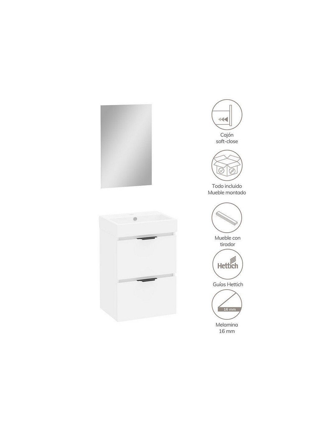 Conjunto lavamanos ALDAY 45 Slim blanco Mueble suspendido con distribución dos cajones de fondo ultra reducido. Los cajones tienen guía oculta Hettich de apertura parcial con sistema amortiguado soft-close y el cajón superior incluye salvasifón. Se entrega montado, en un único bulto. Dimensiones mueble: 45x36 cm.