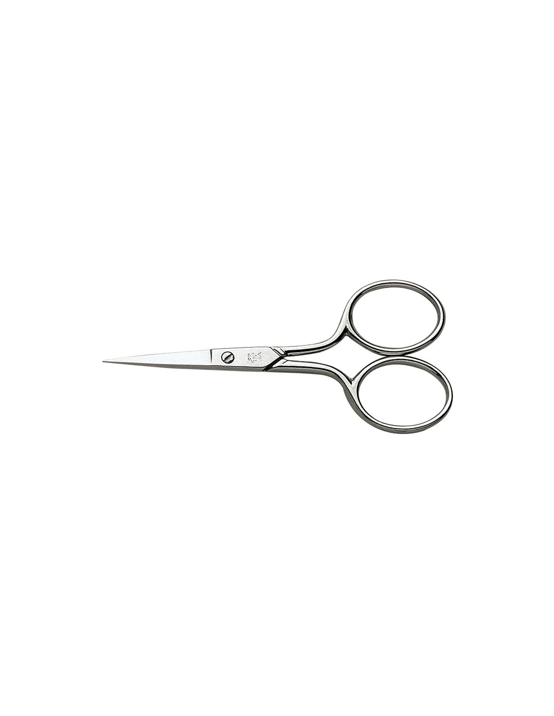 Tijera bordar recta PALMERA serie 800. Acero al carbono, acabado niquelado. Forja en caliente. Dureza hojas 54-58 HRC. Ensamblaje con tornillo para reajustar la presión. Funda plástica individual 4\"