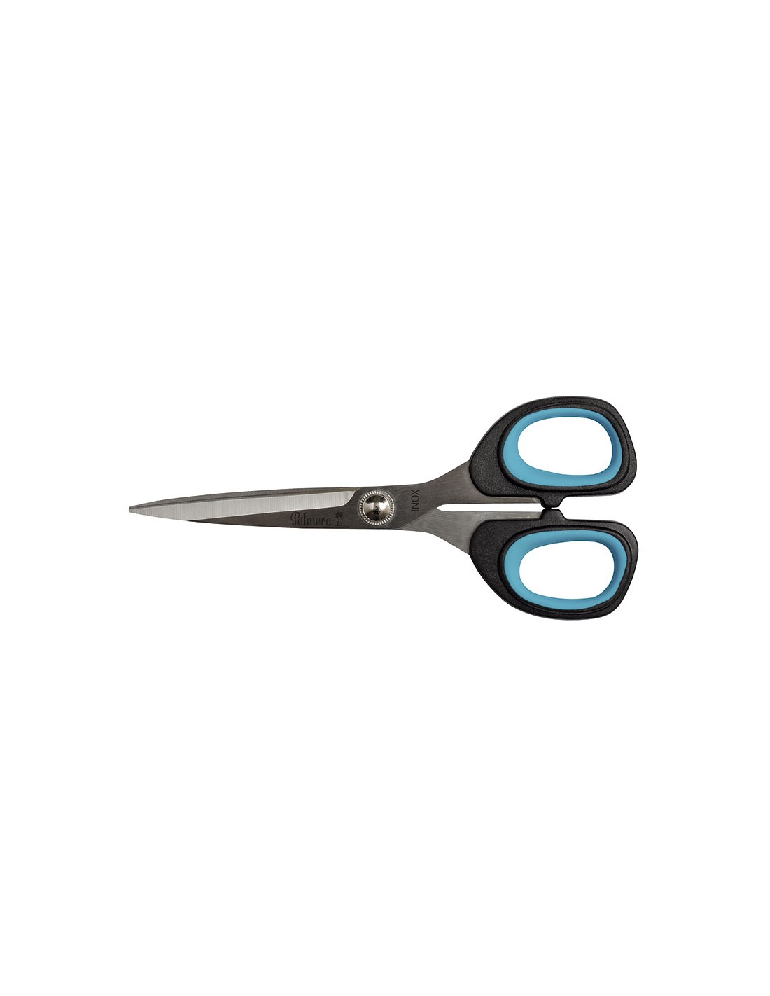 Tijera modista PALMERA serie 804. Acero inoxidable AISI 420. Dureza hoja 52-54 HRC. Mangos bicomponente. Ensamblaje con tornillo bloqueado para evitar que se afloje. Modista 7\"