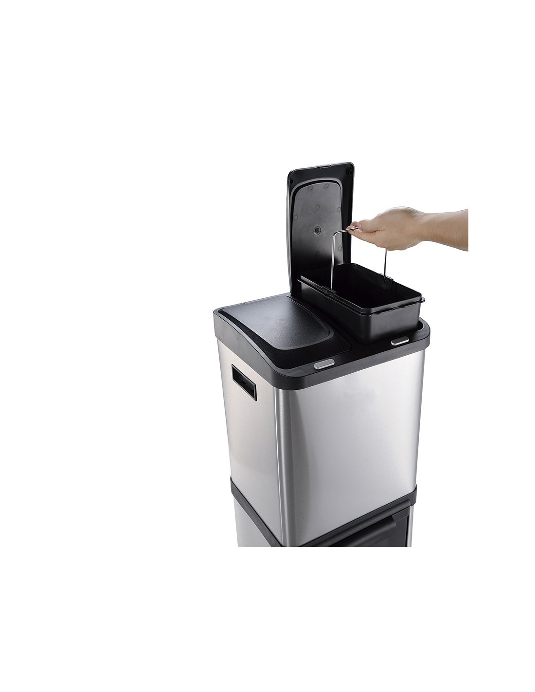 Cubo pedal HABITEX vertical Cuerpo en acero inoxidable satinado antihuella. 3 cubetas plásticas extraíbles en color negro (8l+8l+16l). Apertura a pedal (cubo inferior) y con pulsador (cubos superiores). Asas para transporte. 32 litros. 32,5x31xh.77 cm.