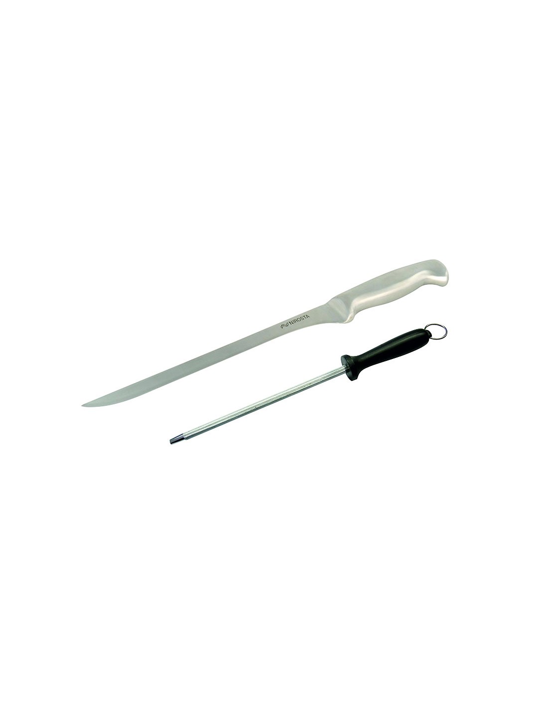 Cuchillo jamonero y chaira FACKELMANN Cuchillo en acero inoxidable. Chaira en ABS y acero. Hoja extremadamente afilada. Diseño moderno y elegante. 3 años de garantía. Cuchillo: 350x30x25 mm.