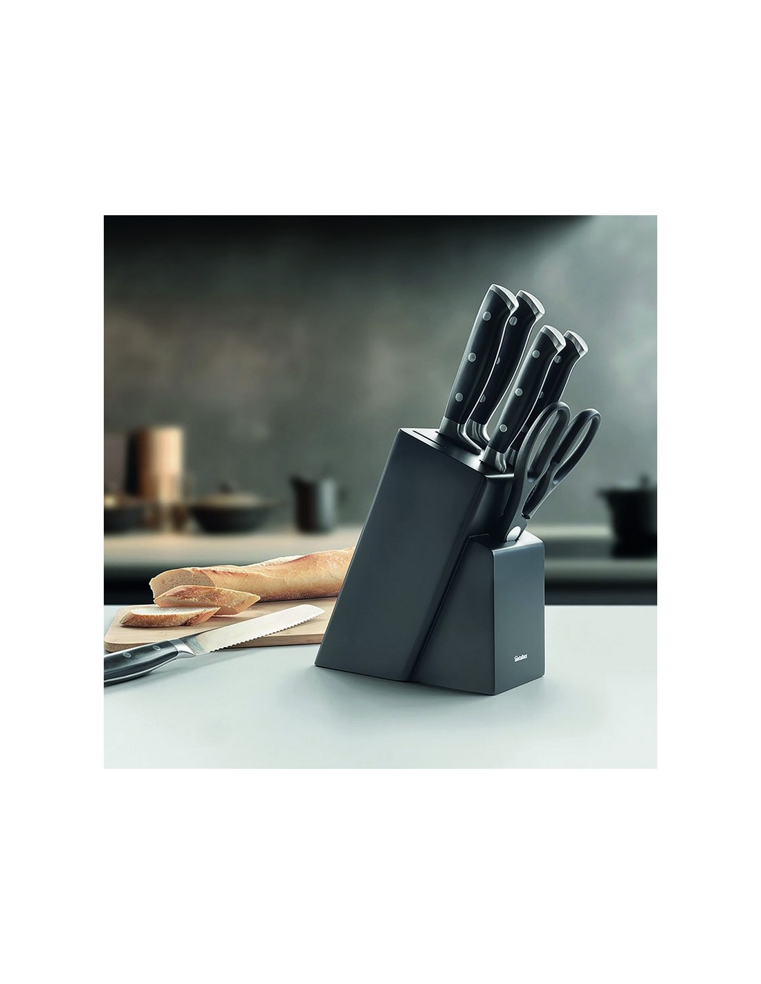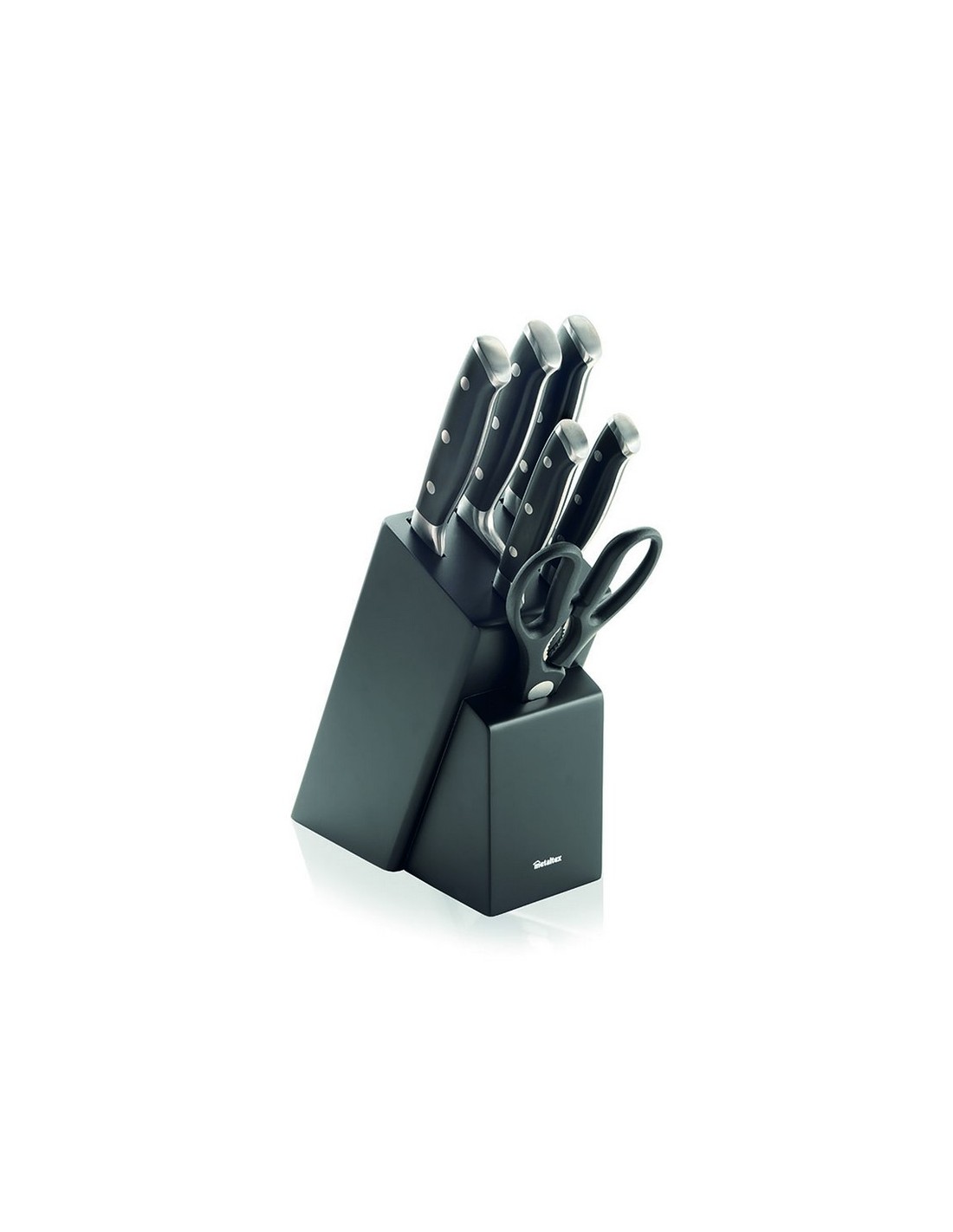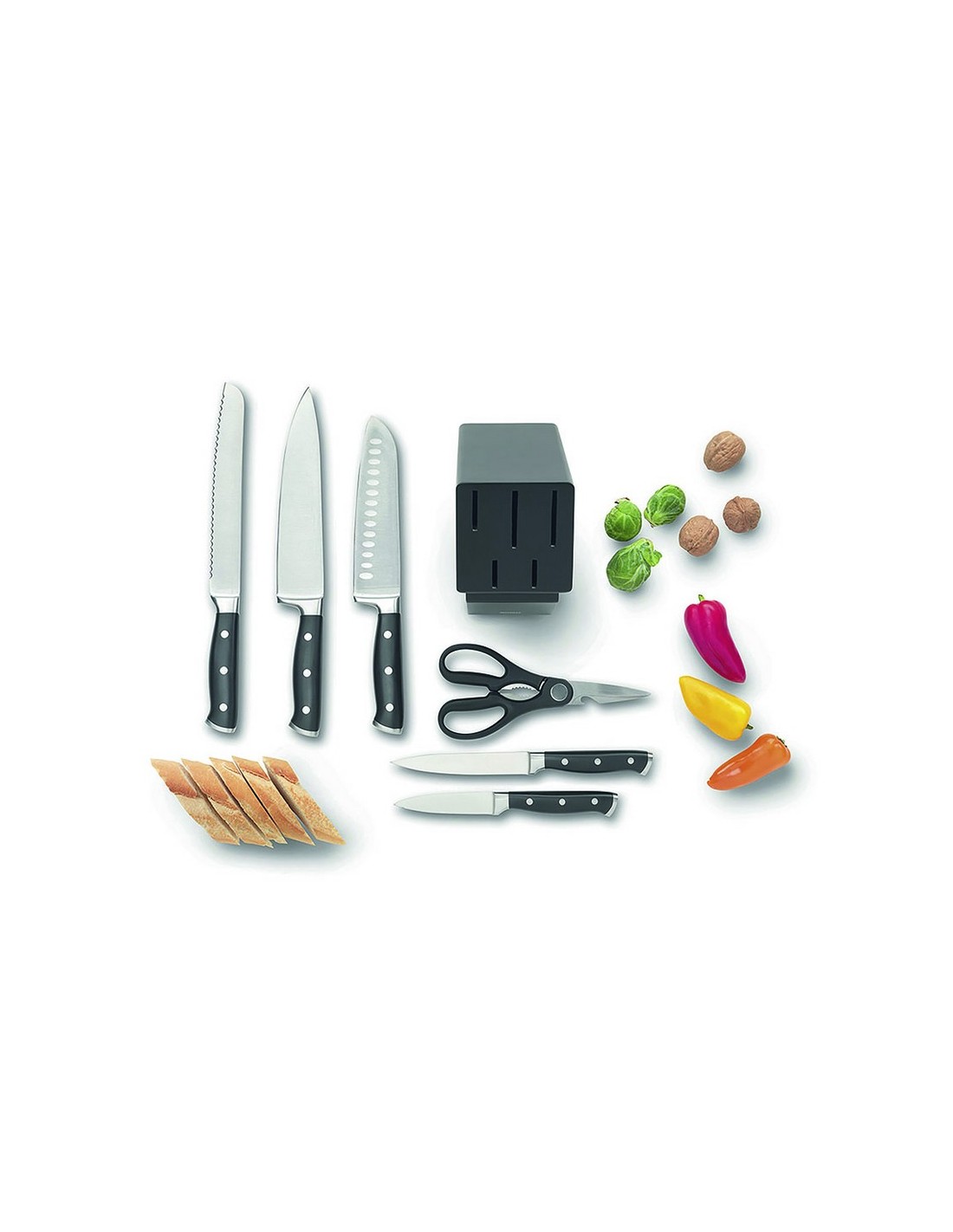 Tacoma completo 5+tijeras Tacoma con pies antideslizantes fabricada con exterior de madera de caucho e interior de madera de pino. Tijeras con hoja de acero inox 1,8 mm y mango PP. Cuchillos con hoja de acero inox al molibdeno de dureza HRC 57 fabricada en una sola pieza y mango ABS acabado suave con 3 remaches inox y tope de metal acabado mate. Incluye: Cuchillo chef, cuchillo Santoku, cuchillo pan, cuchillo multiuso, cuchillo pelador y tijeras multiuso.