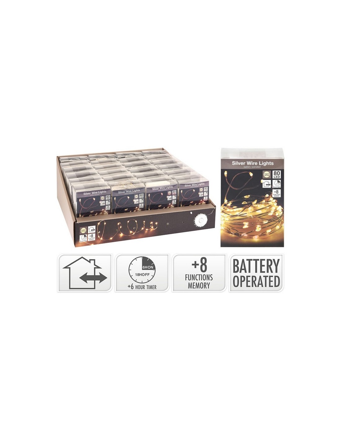 Guirnalda microLed decorativa interior/exterior IP44. Funciona con 3 pilas AA (LR06) no incluidas. Programador 8 funciones. 80 Led. 4 m. Blanco cálido.