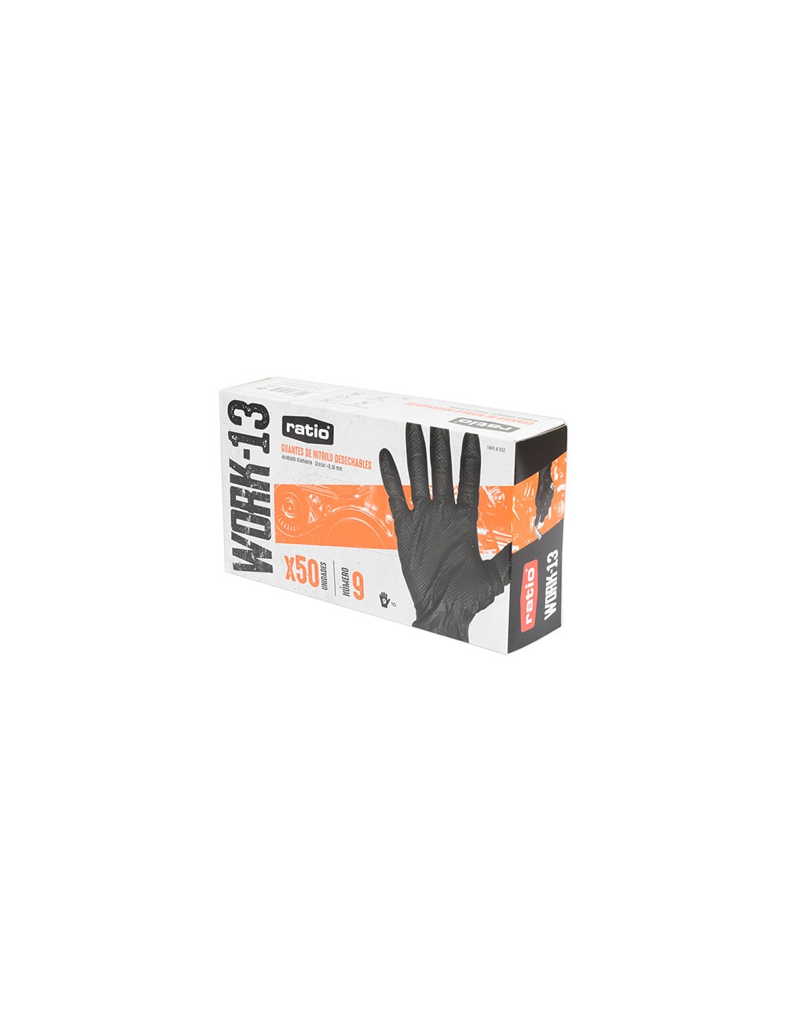 Guante nitrilo desechable RATIO Work-13 Acabado diamante que ofrece una mayor resistencia al desgaste y una mejor adherencia. Proporciona una textura adicional que mejora la destreza y reduce el riesgo de resbalones. Grosor: >0,16 mm. Más grueso que un guante desechable tradicional. Usos: galvanizados, montajes ligeros, mantenimiento de vehículos, agricultura y horticultura, limpieza y mantenimiento industrial, industria alimentaria, procesado de alimentos, tatuadores, peluquerías. EN ISO 374-1:2016+A1:2018 TYPE B, EN ISO 374 - 5: 2016. Caja 50 unidades. Talla 9. Negro. 50 unid.