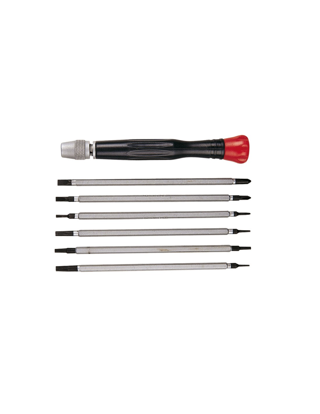 1 Mango destornillador / 6 Varillas doble boca / Plana 2 mm x Phillips Nº00 Torx T5 x T20 / Plana 3 mm x Phillips Nº 0 Torx T6 x T15 / Plana 4 mm x Phillips Nº 1 Torx T8 x T10.
