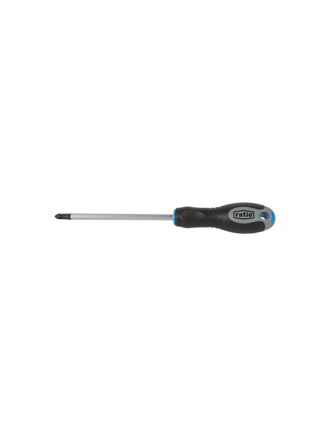 Destornillador RATIO serie DinamycPro. Varilla hexagonal. Acero cromo-vanadio S2. Punta magnética pavonada. Mango antideslizante bimaterial. Pozidriv PZ Nº1 x 100 mm.