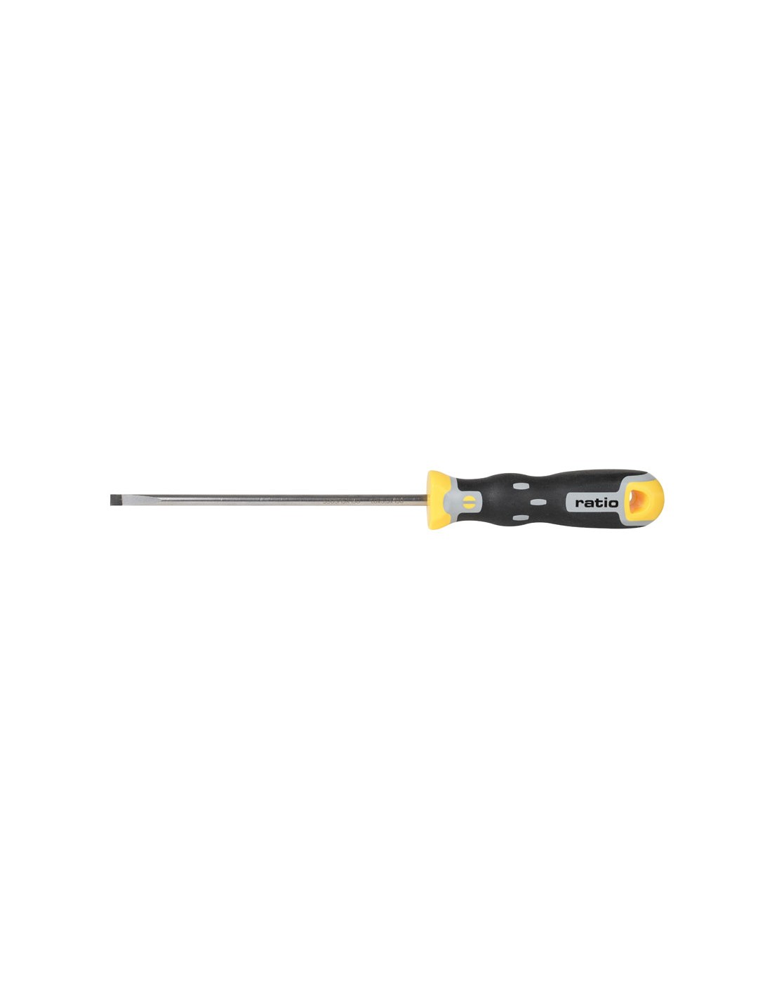 Destornillador RATIO serie Dinamyc Tecno Mango trimaterial antideslizante. Varillas acero molibdeno-vanadio 60 HRc con tratamiento térmico integral. Puntas pavonadas con mecanizado de alta precisión. Fabricación nacional según norma DIN. Recta 1,0x5,5x150 mm.