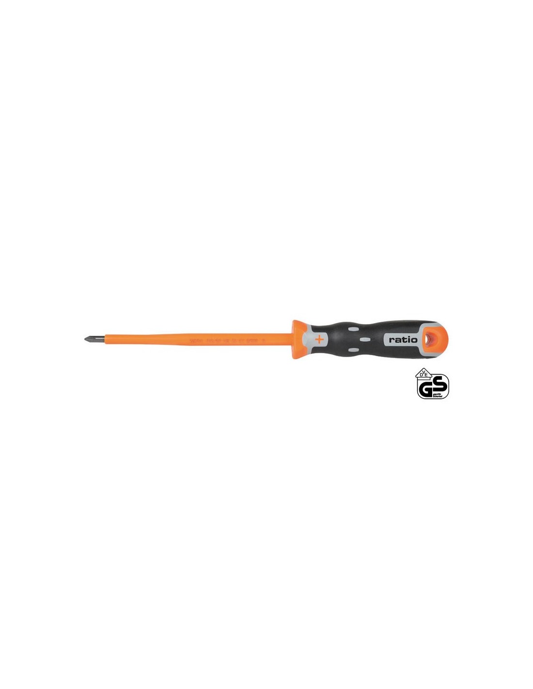 Destornillador varilla aislada RATIO serie DinamycTecno-Aislo Mango trimaterial antideslizante. Varillas acero molibdeno-vanadio 60 HRc aislada para trabajos en baja tensión hasta 1.000 V. Control de tensión unitario con carga de 10.000 V. Fabricación nacional según norma IEC 60900. Phillips Nº1x150 mm.