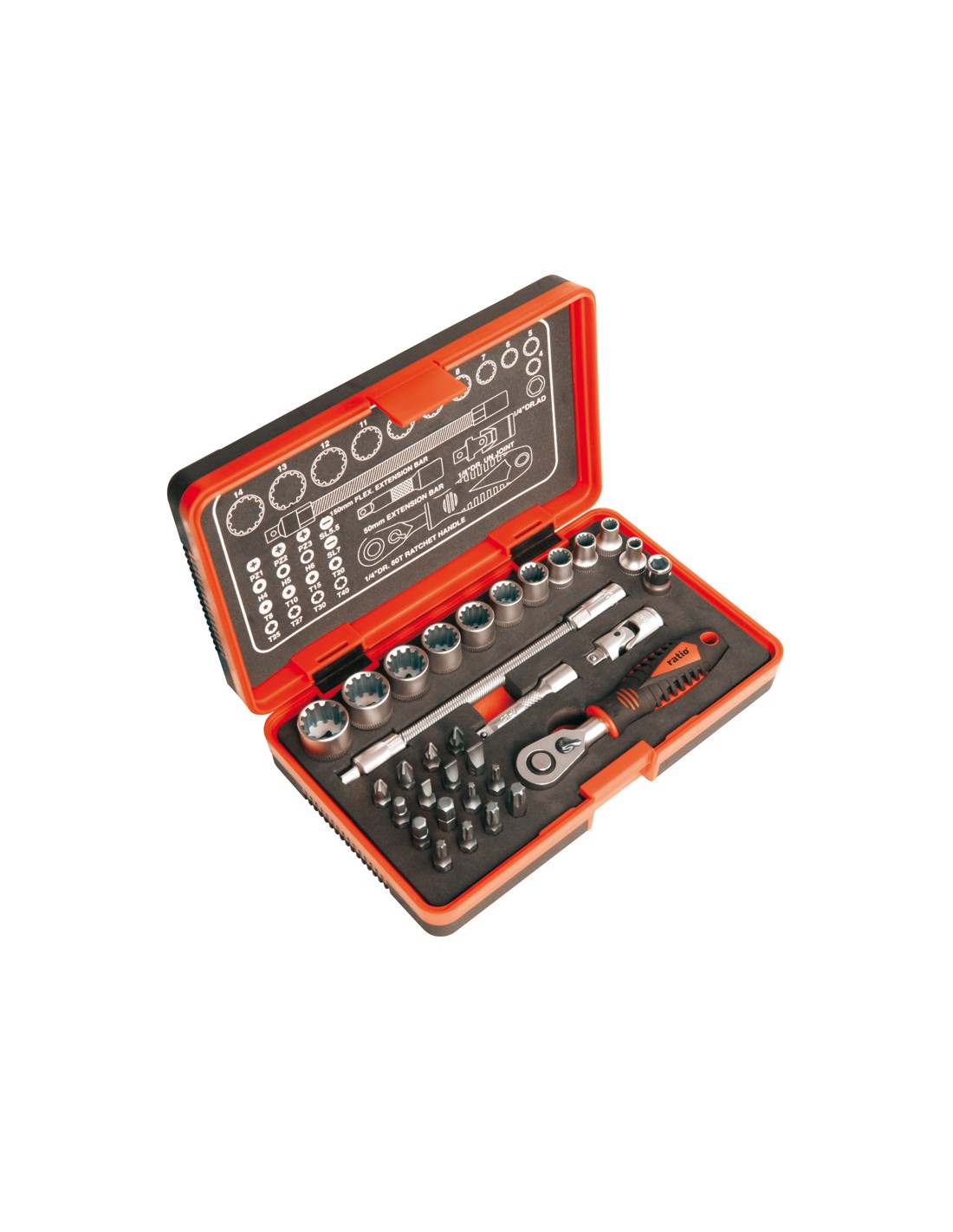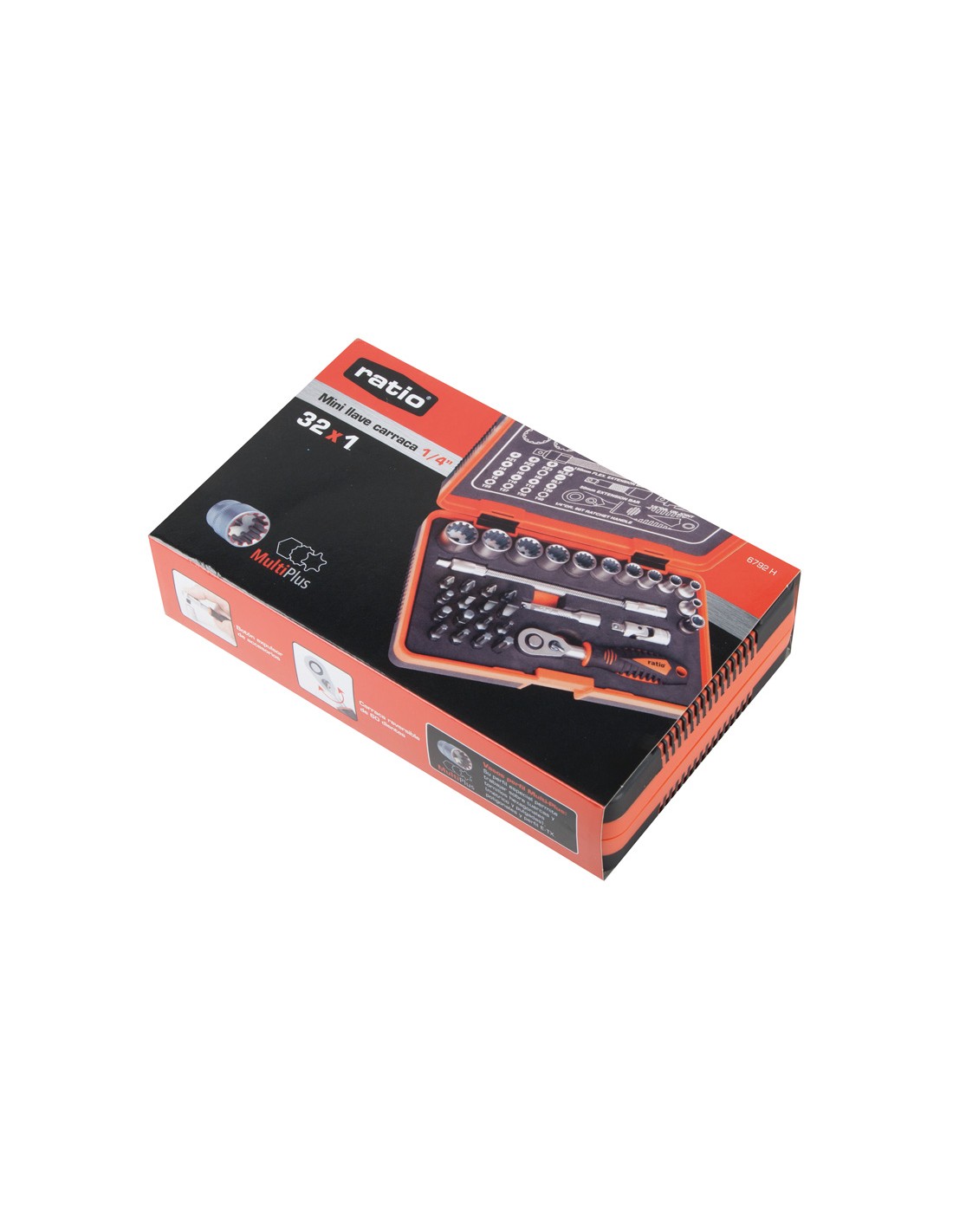 Llave carraca mini RATIO 32 en 1 Carraca reversible 1/4" expulsor Locksystem. Vasos perfil MultiPlus para usar sobre tuercas y tornillos hexagonales (métrico/pulgadas), poligonales y con perfil E-TX. Presentado en estuche plástico bimaterial. Composición: