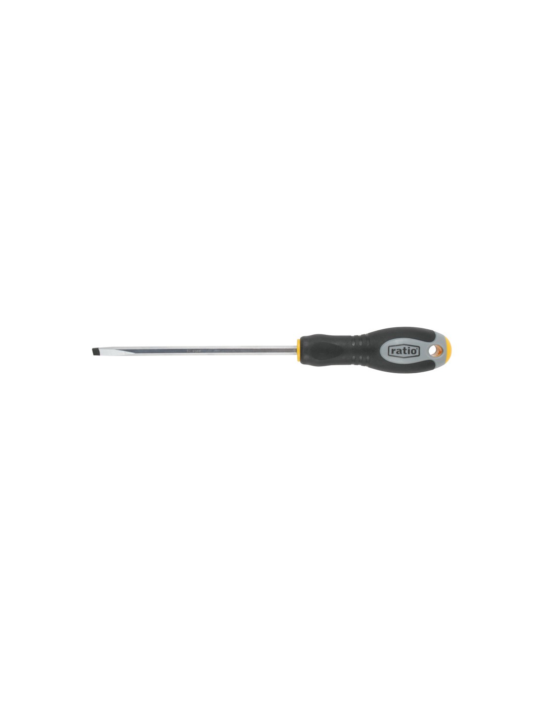 Destornillador RATIO serie DinamycPro Varilla hexagonal. Acero cromo-vanadio S2. Punta magnética pavonada. Mango antideslizante bimaterial. Plana 0,8x4,0x75 mm.
