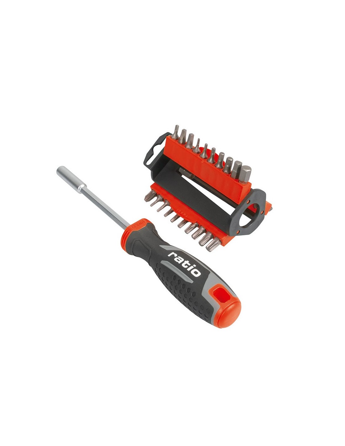 Destornillador portapuntas magnético RATIO 7300-31 Mango destornillador ergonómico antideslizante tri-mamerial magnético 1/4". Varilla acero cromo vanadio. Juego de 30 accesorios. Varilla 100 mm, mango 110 mm. Composición:
