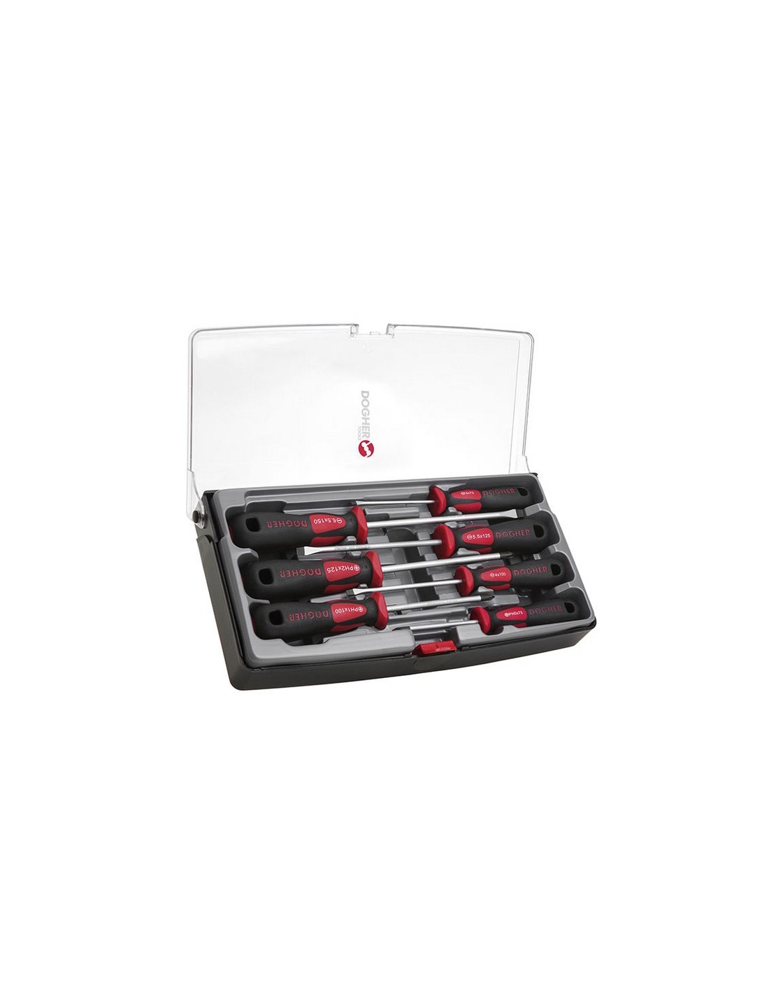 DOGHERJuego 7 destornilladores profesionales DOGHER 330-003 Mango bidiametral: elastómero antideslizante en el 70% del cuerpo. Varilla cromo molibdeno (56Hrc). Puntas protegidas frente a posibles oxidaciones. Plana 0,5x3x75 mm