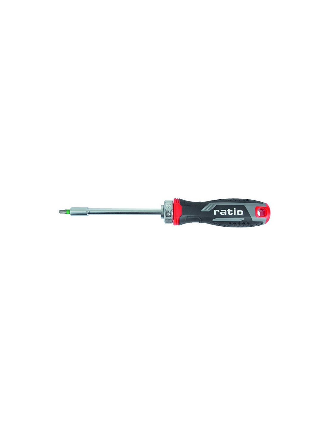 Destornillador portapuntas carraca reversible 14en1 RATIO 7303 Mango ergonómico antideslizante tri-material. Puntas acero S2 con anilla de color. Estuche plástico. 1 mango carraca reversible 36 T.