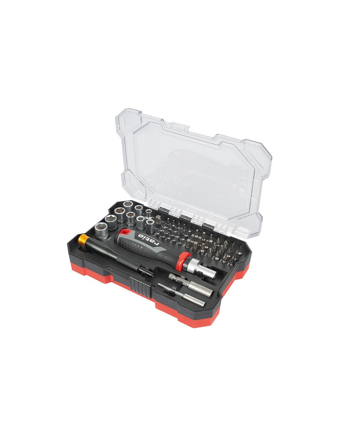 Destornillador (55en1) portapuntas con carraca reversible RATIO 7313H Mango ergonómico antideslizante tri-material. Puntas en acero S2, vasos en CHR-V . Con práctico estuche. Composición: 1 mango carraca reversible 72T magnético. 1 mango aluminio para puntas de
