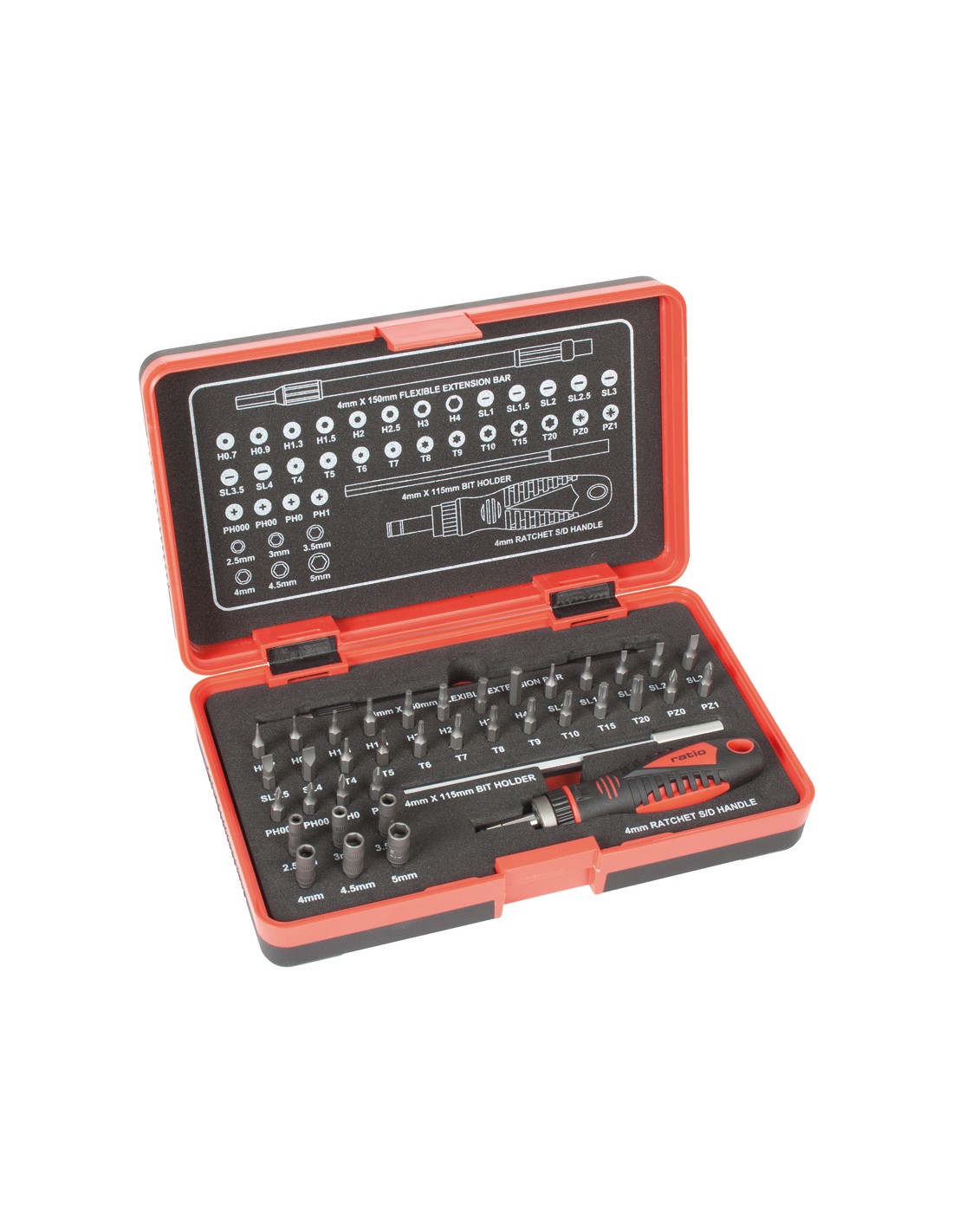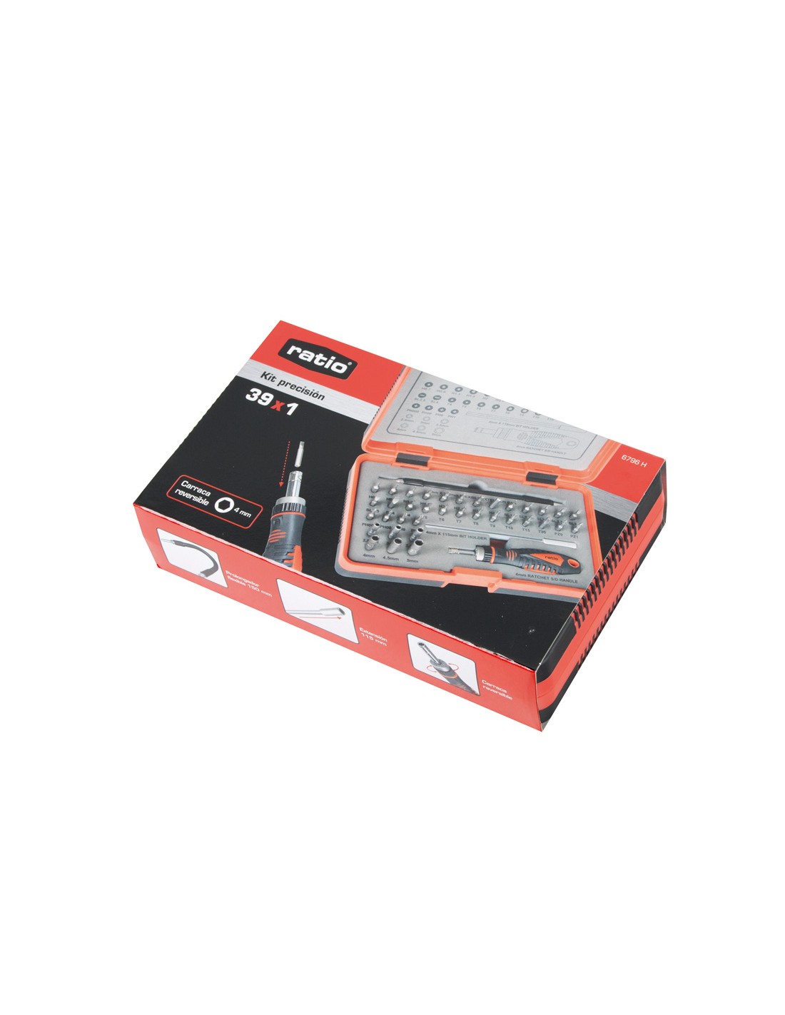 Destornillador precisión RATIO 39 en 1 Mango destornillador carraca reversible. Puntas precisión en acero 8660. Estuche plástico. Composición: \r\n1 Mango destornillador carraca. \r\n1 Prolongadorportapuntas 115 mm. \r\n1 Prolongador portapuntas flexible 150 mm. \r\n30 Puntas atornillado 4x28 mm. \r\nPhillips: Nº000-00-0-1. \r\nPozidriv: Nº0-1. \r\nPlanas: 1-1,5-2-2,5-3-3,5-4 mm. \r