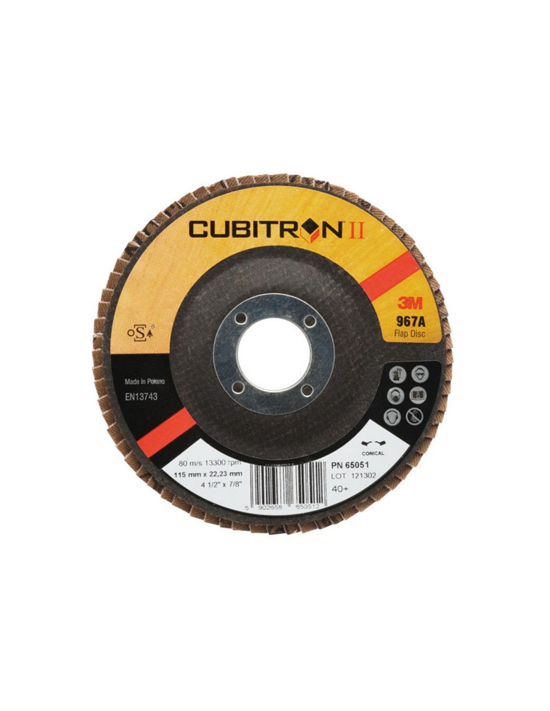 Disco abrasivo láminas 3M Cubitron II 967A Cónico. Grano PSG 3M diseñado para cortar más rápido y durar más. Temperatura de funcionamiento baja. Pueden sustituir a muelas rígidas y discos de fibra. Potenciador de lijado incorporado. ø 115 mm. Grano 40+. 10 unid.
