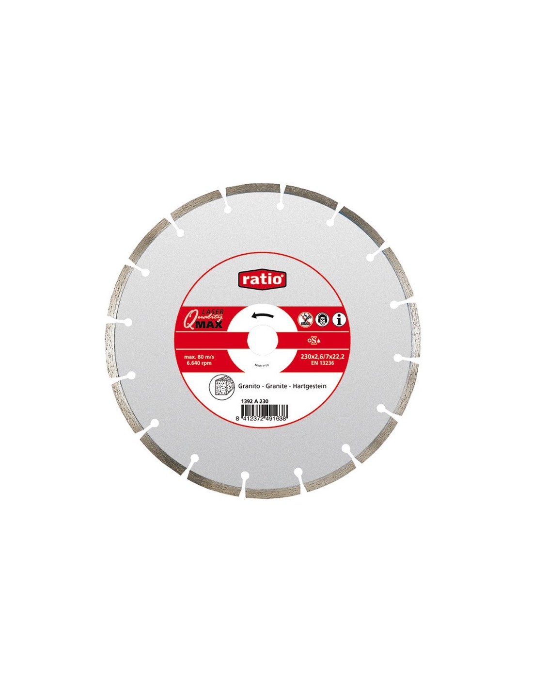 Disco diamante RATIO Quality Max Láser segmentado. Materiales muy duros: granito, hormigón viejo, pizarra, pórfido y otros materiales no abrasivos. ø 115x2,2 mm.