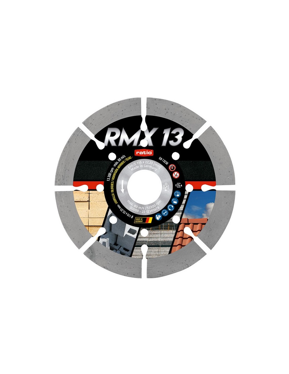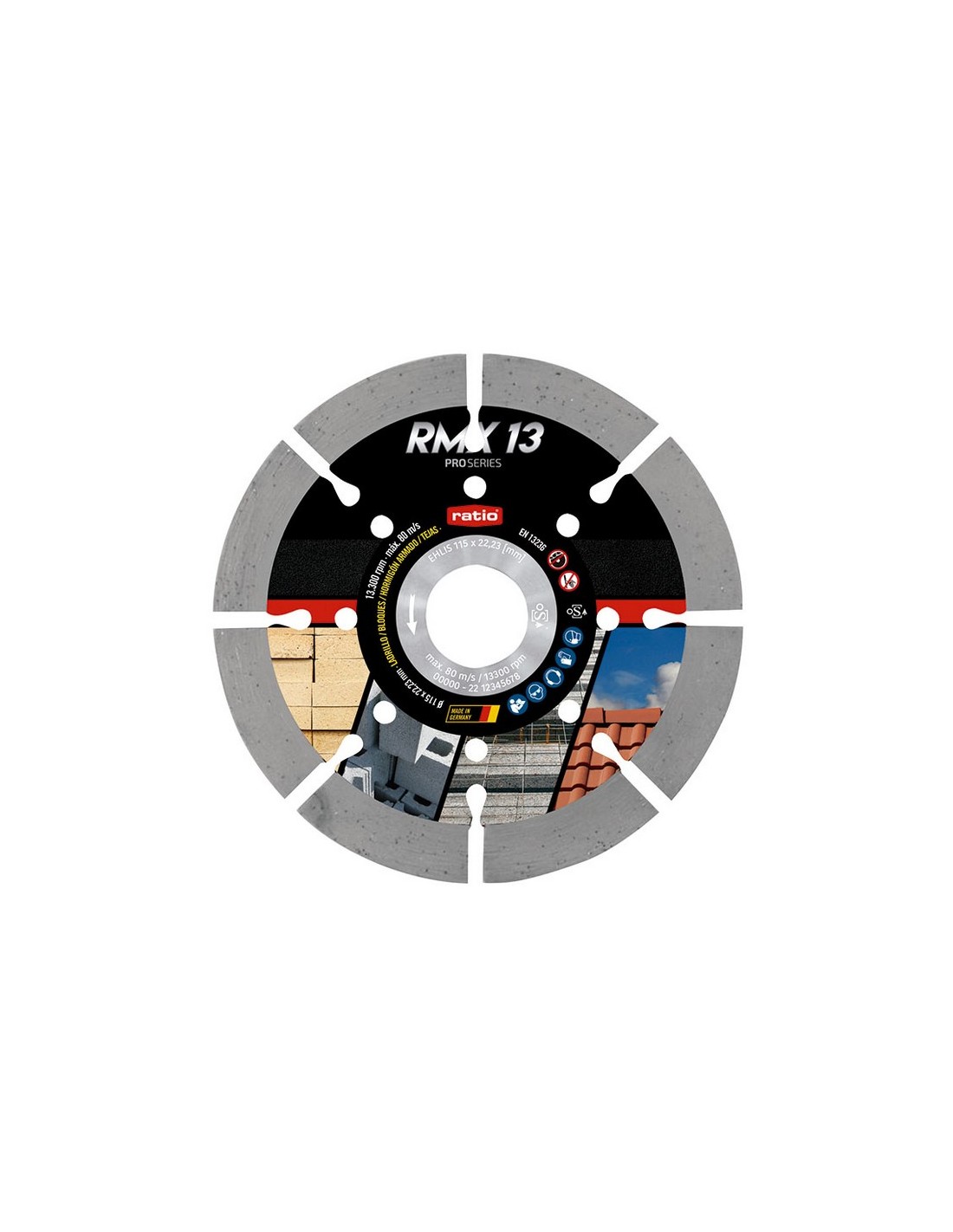 Disco diamante RATIO RMX13 Profesional Soldadura Láser. Perfil segmentado. Segmento 13 mm. Gran vida útil y facilidad de corte. Especialmente indicado para materiales abrasivos. Especial Bloque Canario. Materiales: Hormigón reforzado, productos de hormigón, mampostería / ladrillo, teja, caliza, arenisca, pavimento. (OSA) CONFORME A: EN 13236. ø 115x2,4 mm.