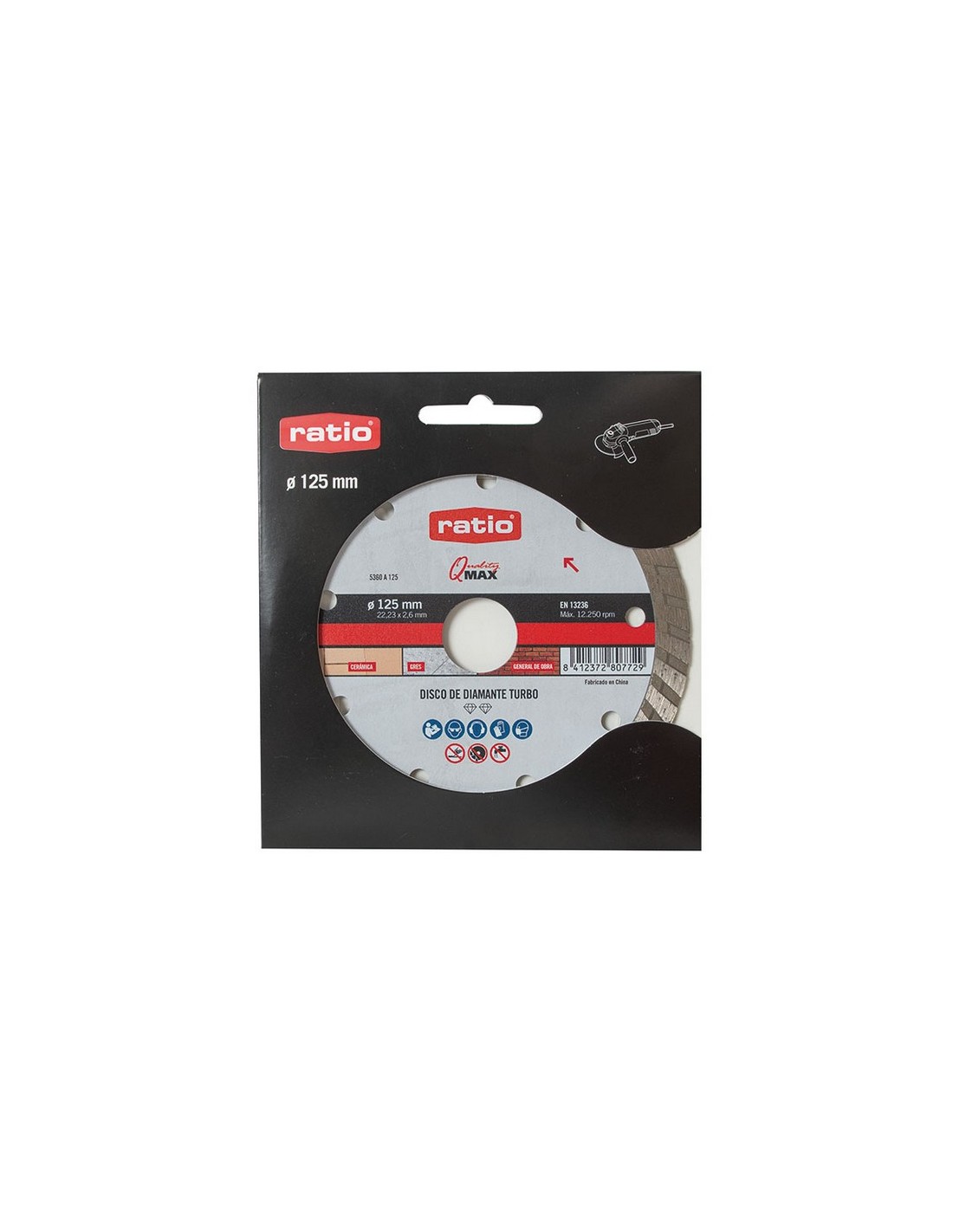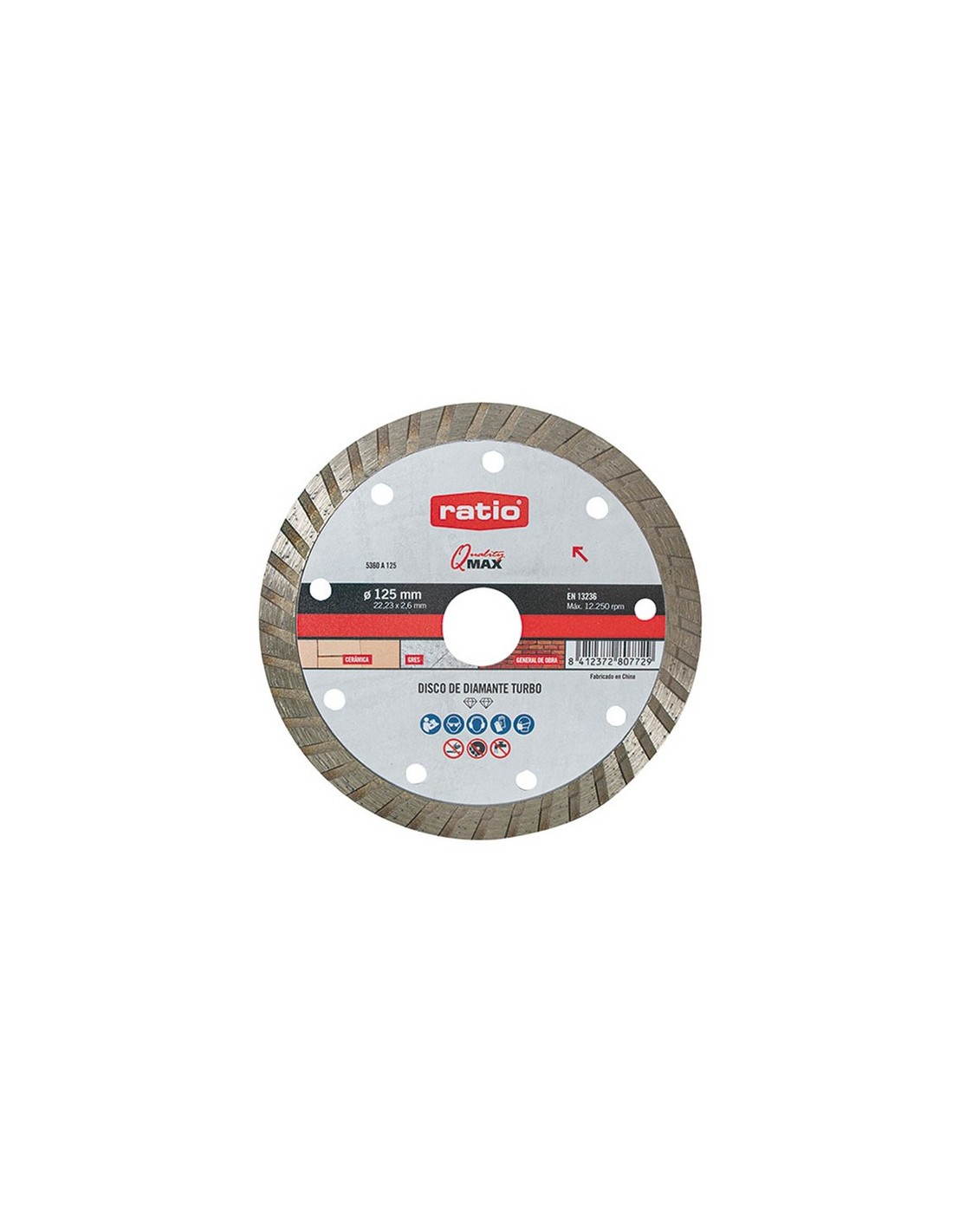 Disco diamante Turbo RATIO Quality Max 5360 Soldadura sinterizado. Perfil turbo. Segmento 10 mm. Disco corte de diamante, para ámbito de aplicación general de obra universal, gres y cerámica. CONFORME A: EN 13236. ø 125x2,6 mm.