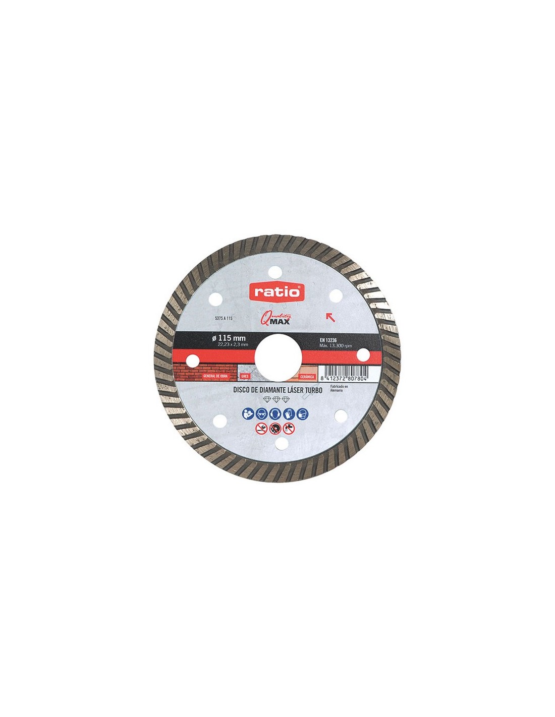 Disco diamante Turbo RATIO Quality Max 5375 Soldadura láser. Perfil turbo. Segmento 10 mm. Disco corte de diamante, para ámbito de aplicación en materiales duros. Como, gres (no porcelánico), ladrillo duro, cerámica y general de obra. Muy versátil y gran rendimiento. CONFORME A: EN 13236. ø 115x2,3 mm.