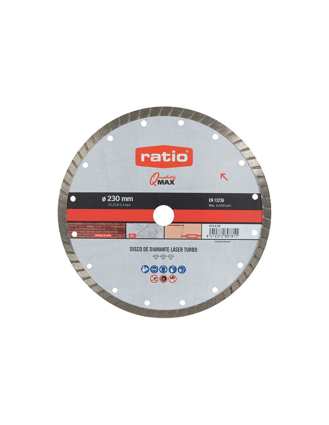 Disco diamante Turbo RATIO Quality Max 5375 Soldadura láser. Perfil turbo. Segmento 10 mm. Disco corte de diamante, para ámbito de aplicación en materiales duros. Como, gres (no porcelánico), ladrillo duro, cerámica y general de obra. Muy versátil y gran rendimiento. CONFORME A: EN 13236. ø 230x2,3 mm.