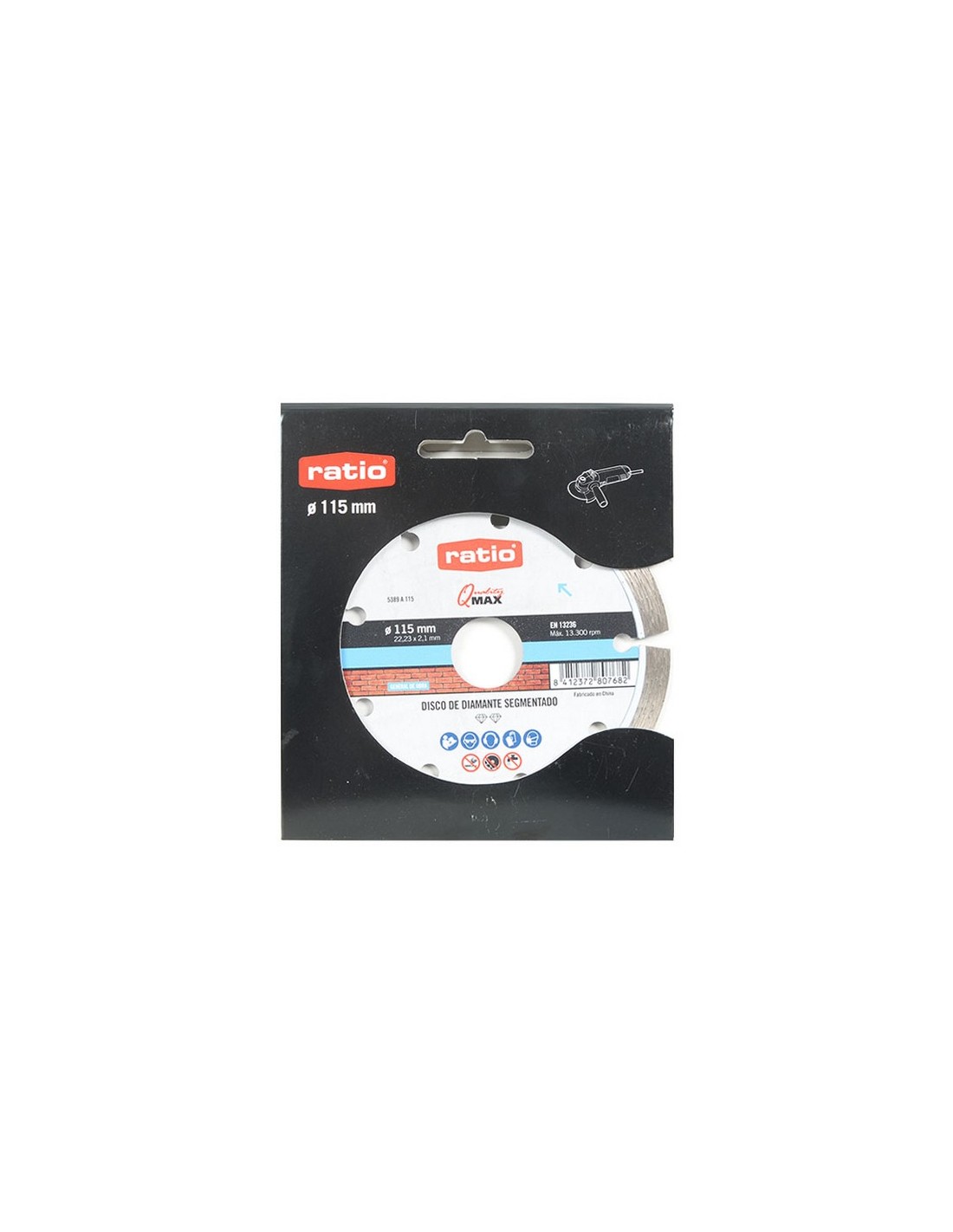 Disco diamante RATIO Quality Max 5389 Soldadura sinterizado. Perfil segmentado. Segmento 10 mm. Disco corte de diamante, para ámbito de aplicación general de obra universal. CONFORME A: EN 13236. ø 115x2,1 mm.