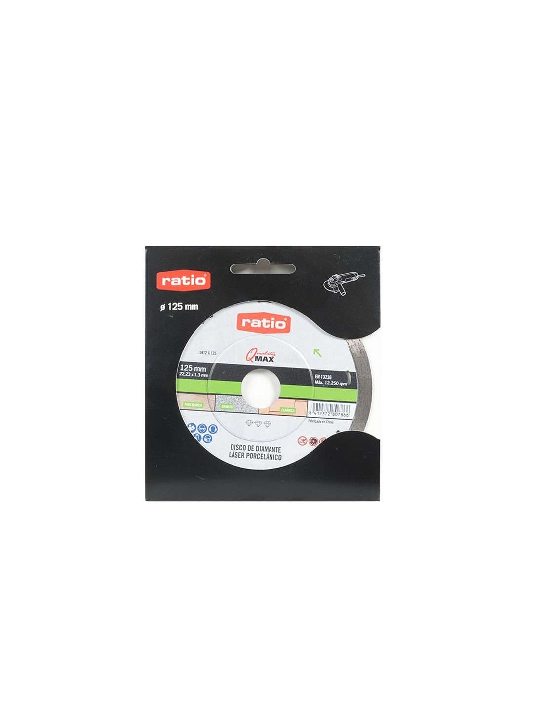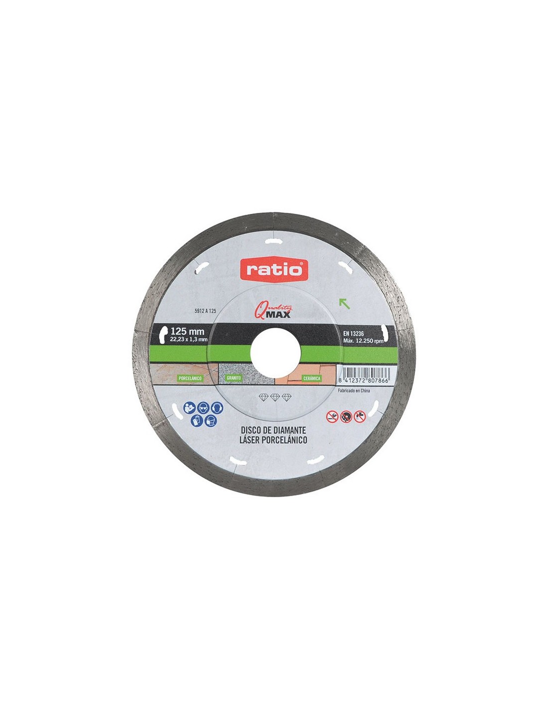 Disco diamante Turbo porcelánico Fast/Clean RATIO Quality Max Soldadura láser. Disco perfecto continuo para porcelánico. Corte rápido y limpio. Extrafino con segmento 5 mm. Gran rendimiento. Para: Placas de granito, cerámica y porcelánico. CONFORME A: EN 13236. ø 125x1,3 mm.