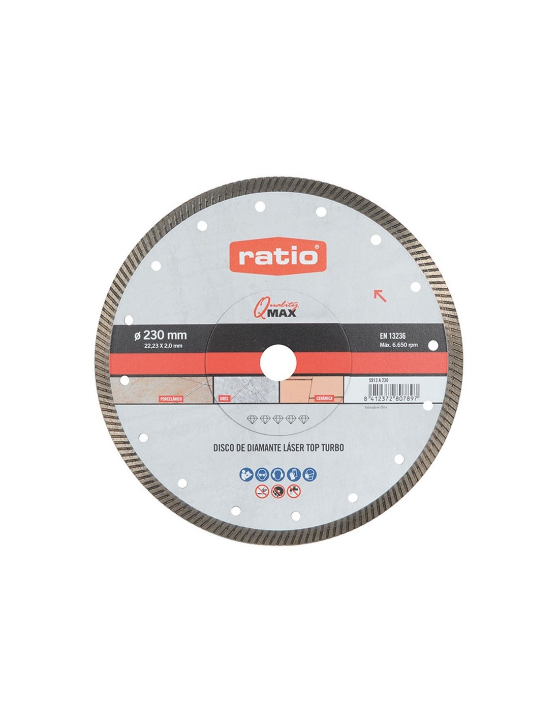 Disco diamante Turbo versátil gres/porcelánico RATIO Quality Max Soldadura láser. Disco turbo para porcelánico de diferentes durezas y muy versátil. Extrafino (a menor presión más capacidad de corte) con segmento 10 mm. Alma reforzada y ventilada. Para: porcelánico, gres, cerámica, teja y fibra de vidrio. CONFORME A: EN 13236. ø 230x2,0 mm.