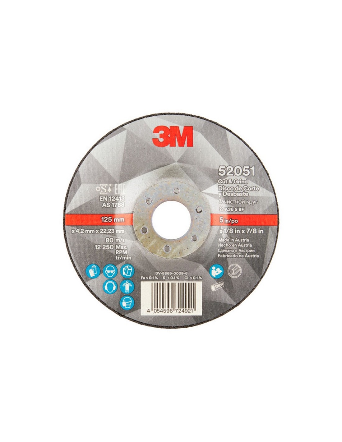 Disco corte y desbaste 3M T27 Tecnología de grano PSG que aumenta la velocidad y la vida útil del abrasivo. Alto rendimiento a un precio asequible. Disco rígido y reforzado con resina está diseñado para su uso como disco de desbaste y como disco de corte en sustratos de acero inoxidable y de acero templado. ø 125x4,2x22 mm. 10 unid.