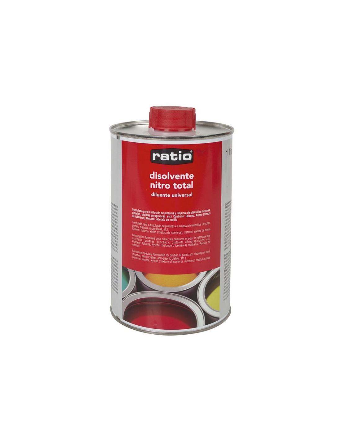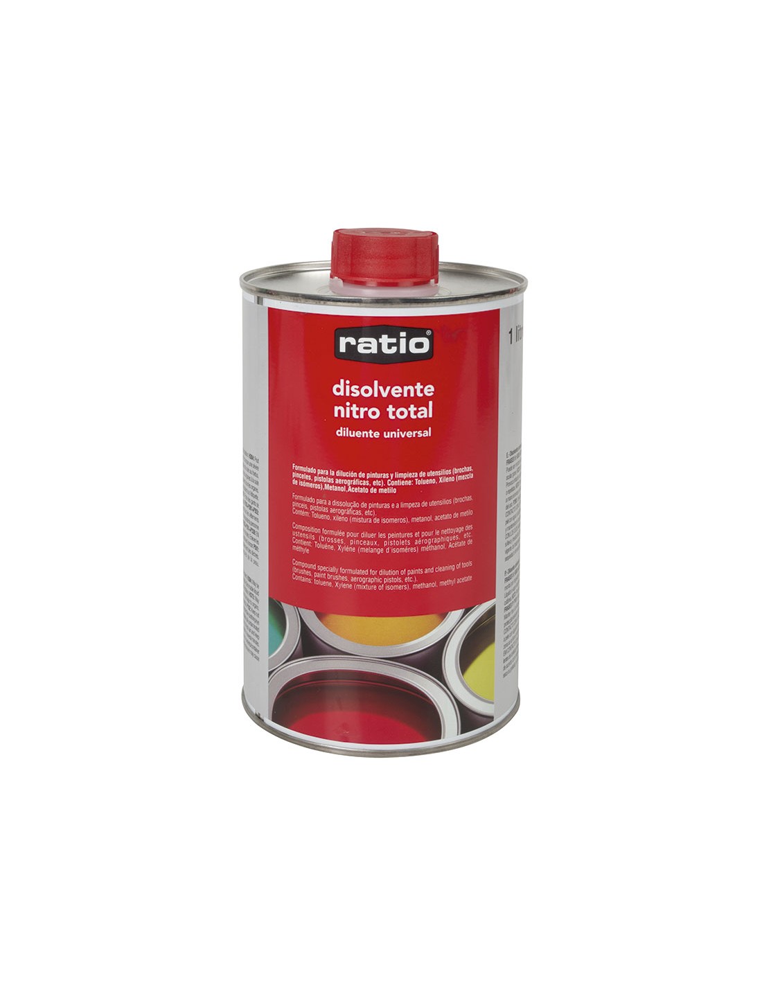 Entrega lun. 9 5,45 € Disolventes DISOLVENTE UNIV.NITRO TOTAL RATIO 500 ML ratio 559B1 3,15 € Disolvente universal RATIO Nitro Total. Dilución de pinturas y limpieza de utensilios (brochas, pinceles, pistolas aerográficas, etc). 500 ml. Añadir al carrito