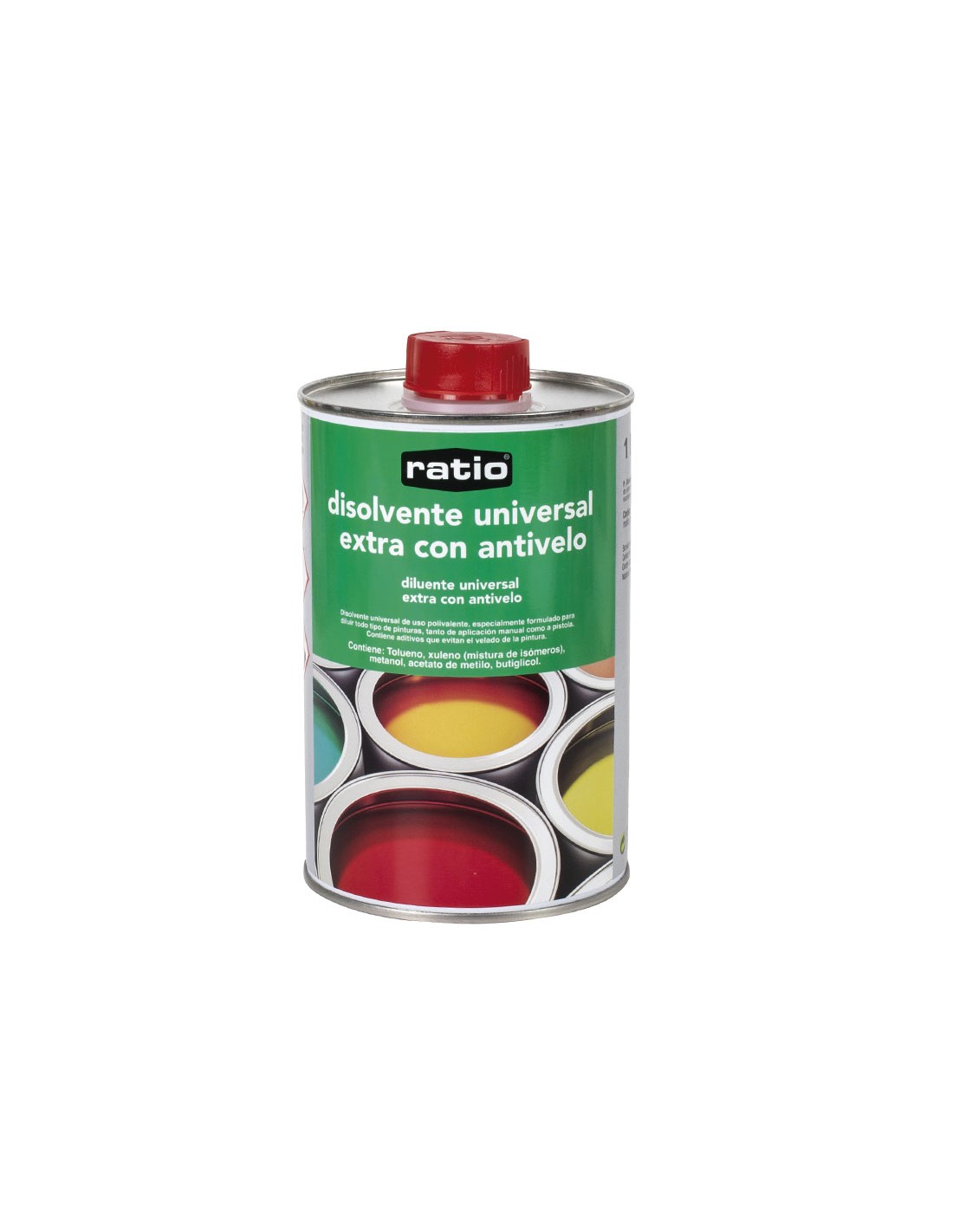 Disolvente universal extra con antivelo RATIO. Especialmente formulado para diluir todo tipo de pinturas, tanto de aplicación manual como pistola. Contiene aditivos que evitan el velado de las pinturas. 1 litro.