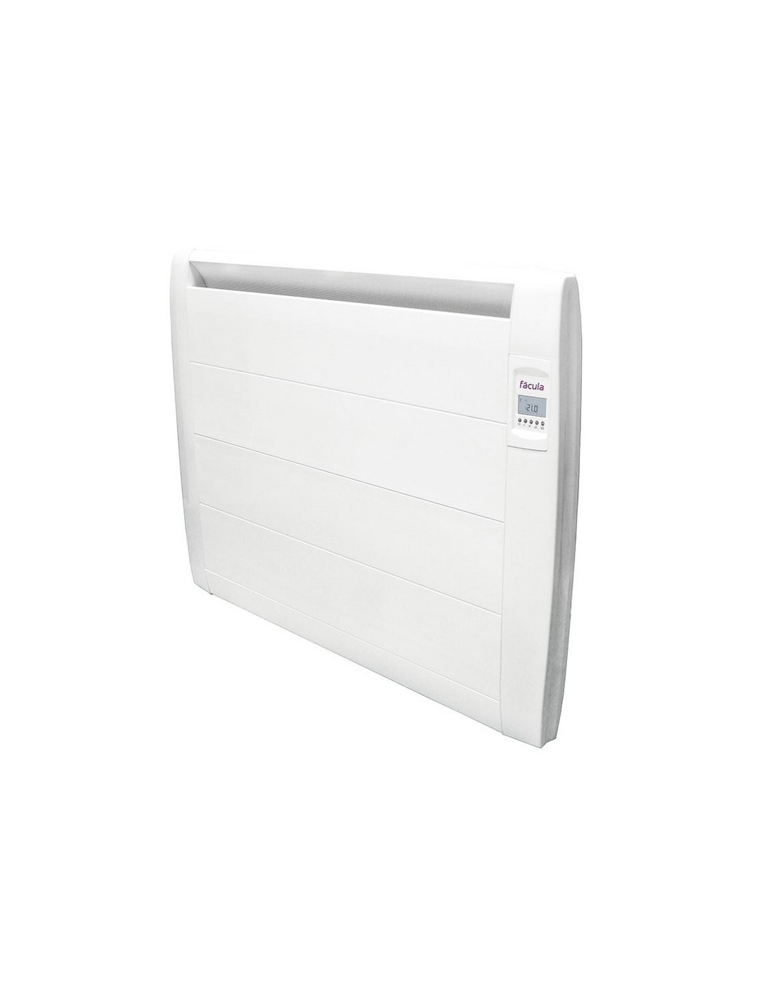 Emisor térmico seco FÁCULA Serie L Fabricado en aluminio con diseño ultrafino. Programa-ble 7 días x 24 horas. Sensor de temperatura NTC con precisión de 0,1ºC. Extra-silencioso. Control inteligente de activación anticipada. Función de ventanas abiertas. Patas incluidas. Fabricado en España. 900 W. 56x6xh.58 cm.